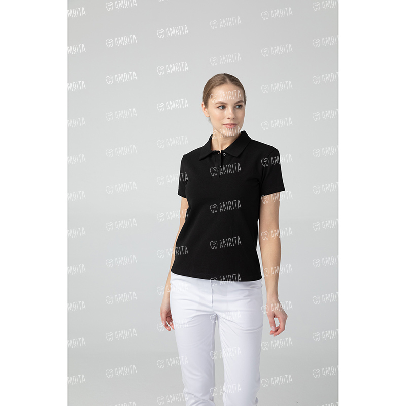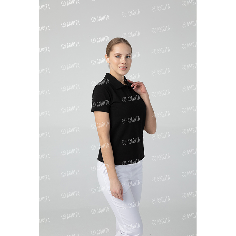 Женская медицинская рубашка поло Dr.Nice с коротким рукавом и отложным воротничком. Застежка на пуговицах, в боковых швах имеются разрезы.