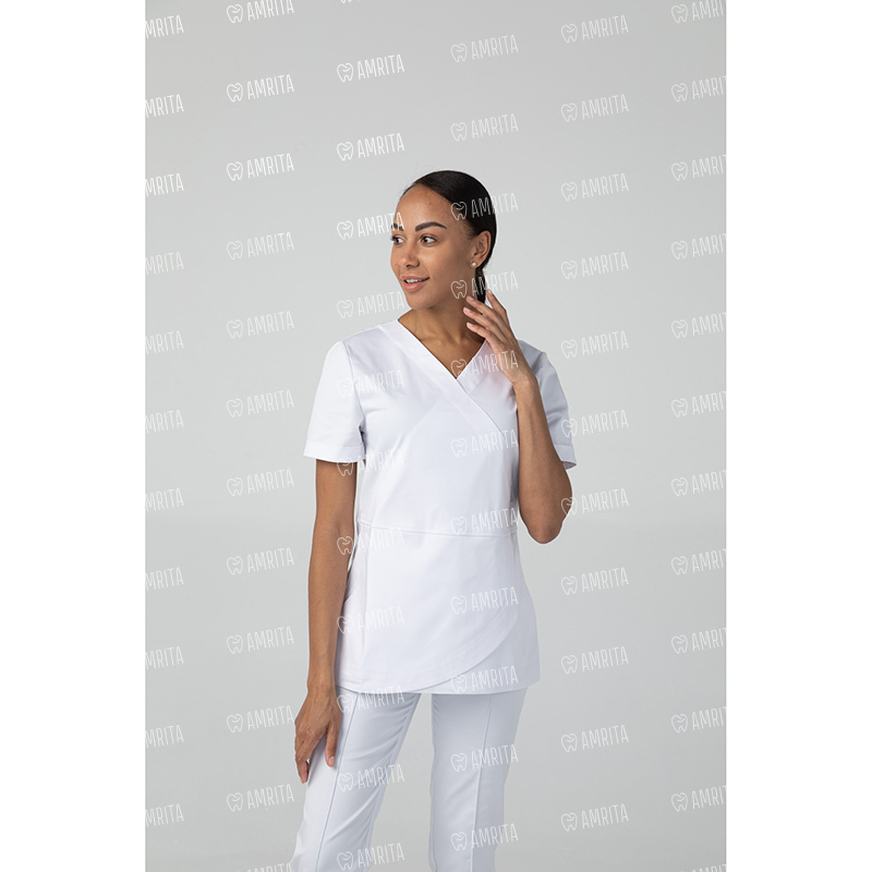 Женская медицинская туника с V-образным вырезом от бренда Dr.Nice выполнена в современном стиле с оригинальной дизайнерской отделкой с имитацией запаха по передней части изделия. Модель прямого кроя с коротким рукавом.