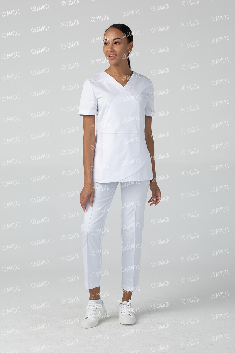 Женская медицинская туника с V-образным вырезом от бренда Dr.Nice выполнена в современном стиле с оригинальной дизайнерской отделкой с имитацией запаха по передней части изделия. Модель прямого кроя с коротким рукавом.