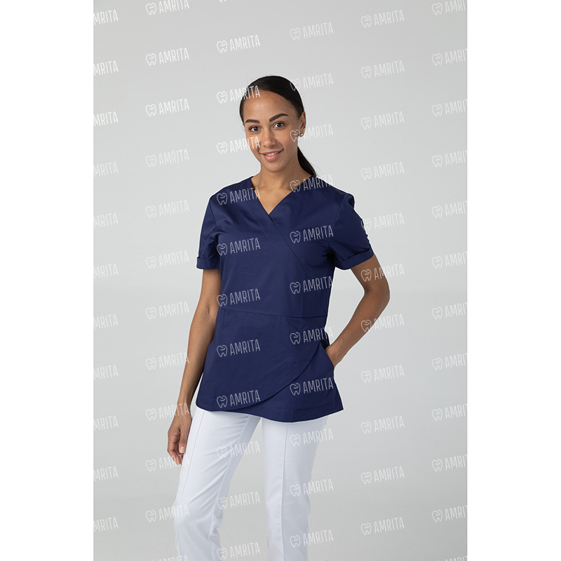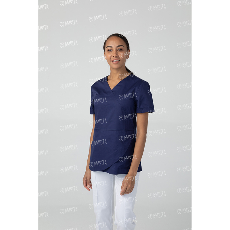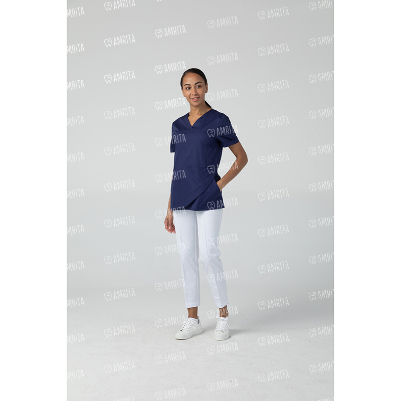 Женская медицинская туника с V-образным вырезом от бренда Dr.Nice выполнена в современном стиле с оригинальной дизайнерской отделкой с имитацией запаха по передней части изделия. Модель прямого кроя с коротким рукавом.