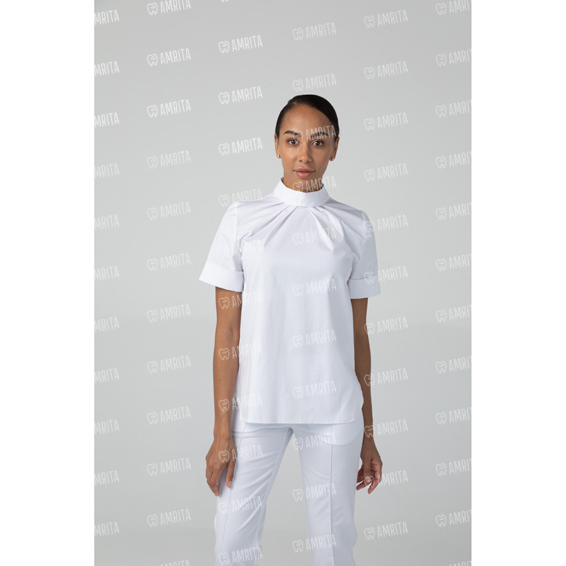 Медицинская женская туника бренда Dr.Nice выполнена с воротником-стойкой и с короткими рукавами. Модель застегивается сзади на кнопки.