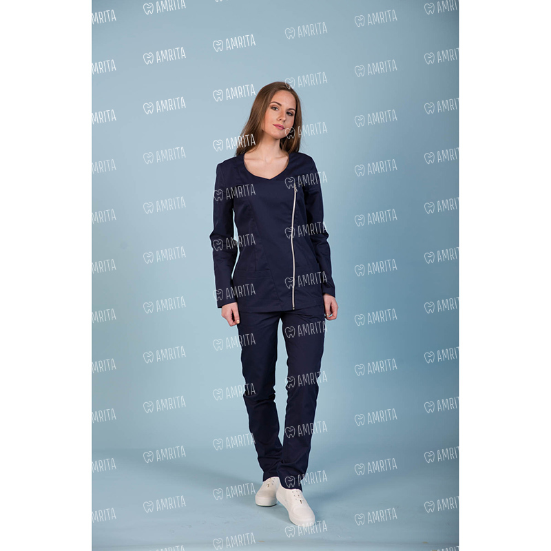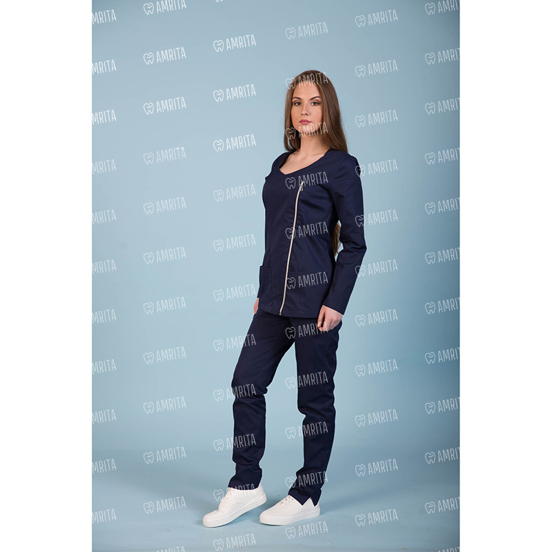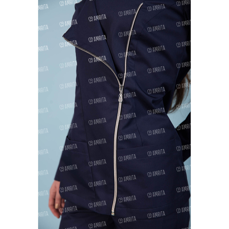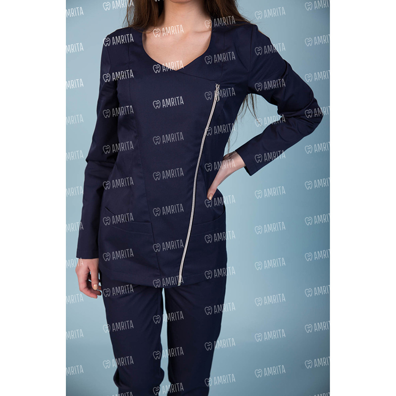 Главная особенность модели — асимметричная застежка-молния, проходящая по диагонали. Этот элемент не только придает изделию уникальный характер, но и визуально сужает талию и вытягивает силуэт. Длинный рукав делает эту тунику незаменимой для прохладных кабинетов и добавляет образу официальности, полностью закрывая руки. Округлый вырез горловины смягчает строгие линии кроя, деликатно открывая шею. В конструкции предусмотрены два накладных кармана, которые гармонично вписаны в нижнюю часть изделия.