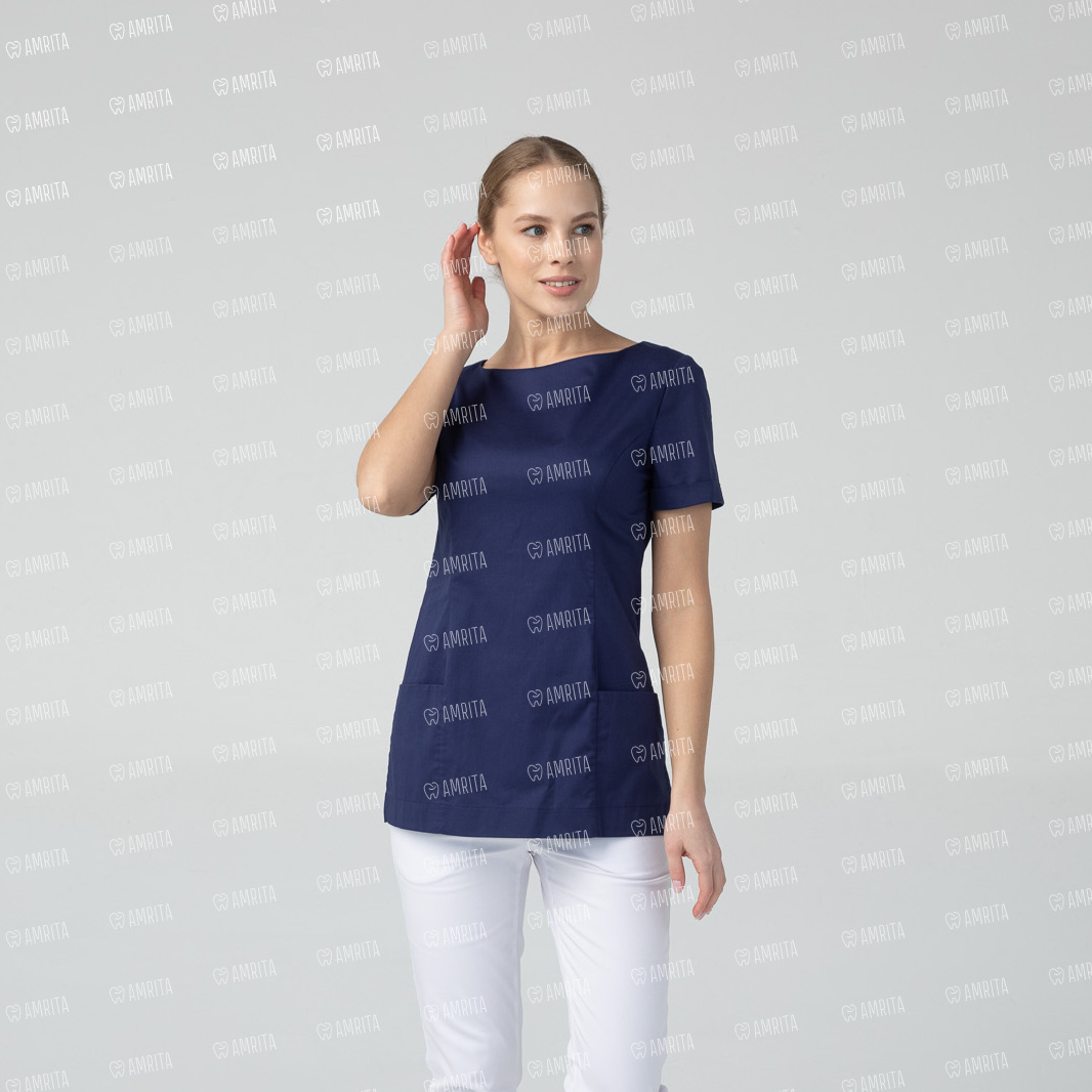 Медицинская женская туника бренда Dr.Nice с короткими рукавами имеет округлый воротник, застёжку-молнию сзади, два накладных кармана спереди и боковые разрезы для свободы движения.