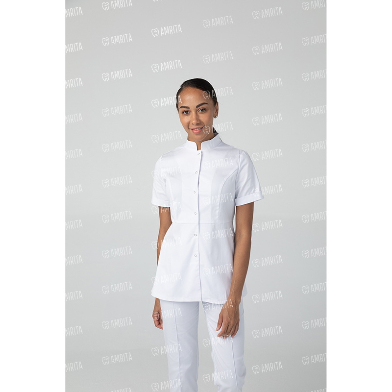 Медицинская туника отрезная по талии от бренда Dr.Nice имеет воротник-стойку, короткий рукав с отворотом и вытачки на груди для лучшего прилегания. Изделие застегивается на металлические кнопки спереди.