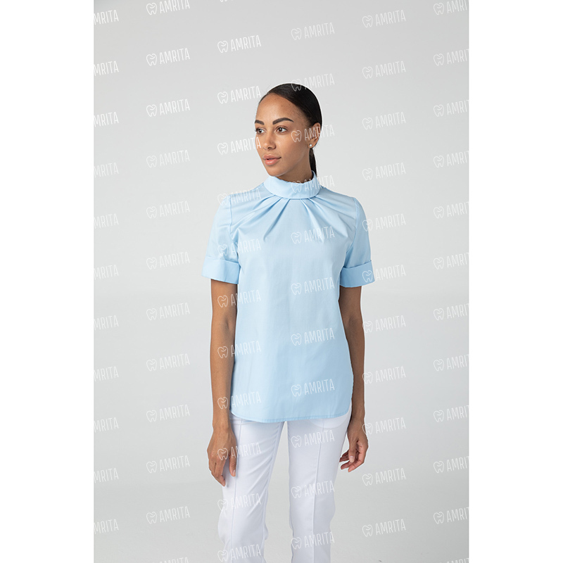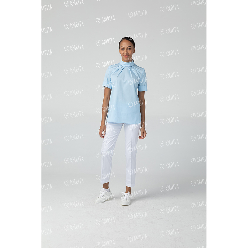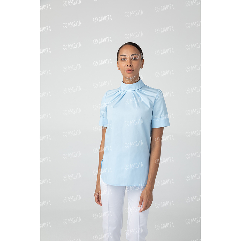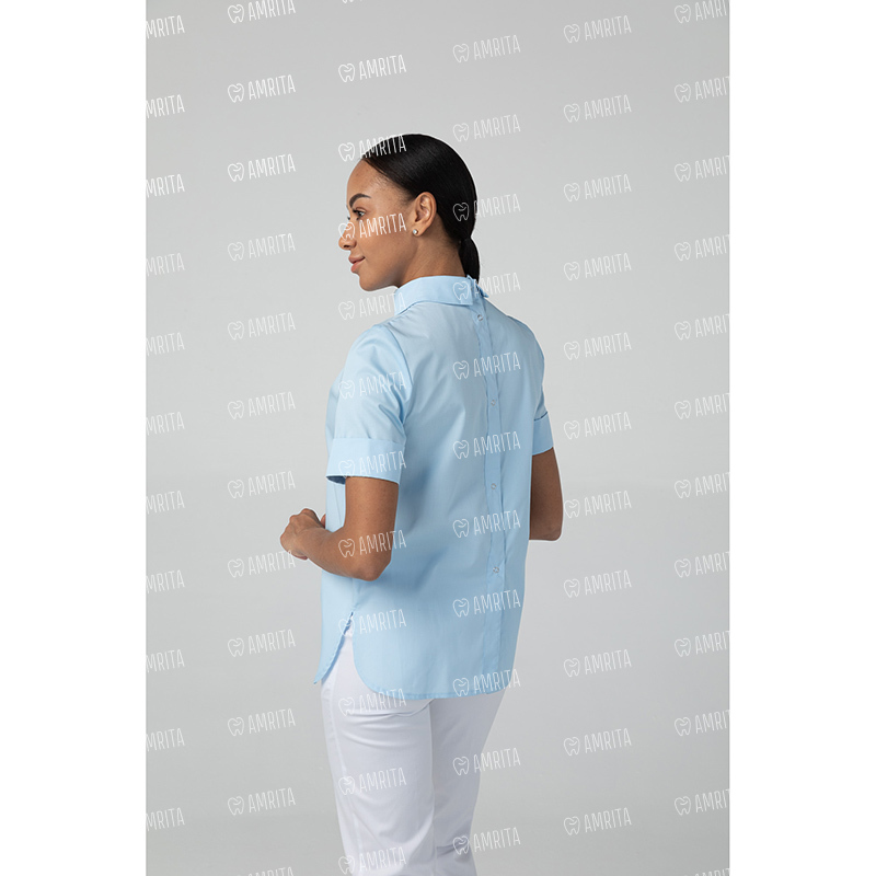 Медицинская женская туника бренда Dr.Nice выполнена с воротником-стойкой и с короткими рукавами. Модель застегивается сзади на кнопки.