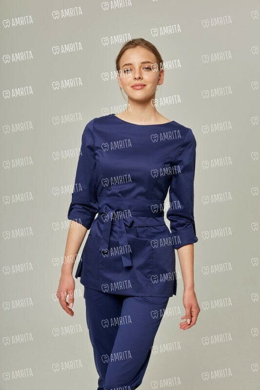 Медицинская туника женская с длинными рукавами от бренда Dr.Nice имеет округлый воротник, два накладных кармана спереди, разрезы по бокам и застёжку-молнию сзади. Длина рукава регулируется отворотом с закреплением пуговицей сбоку.