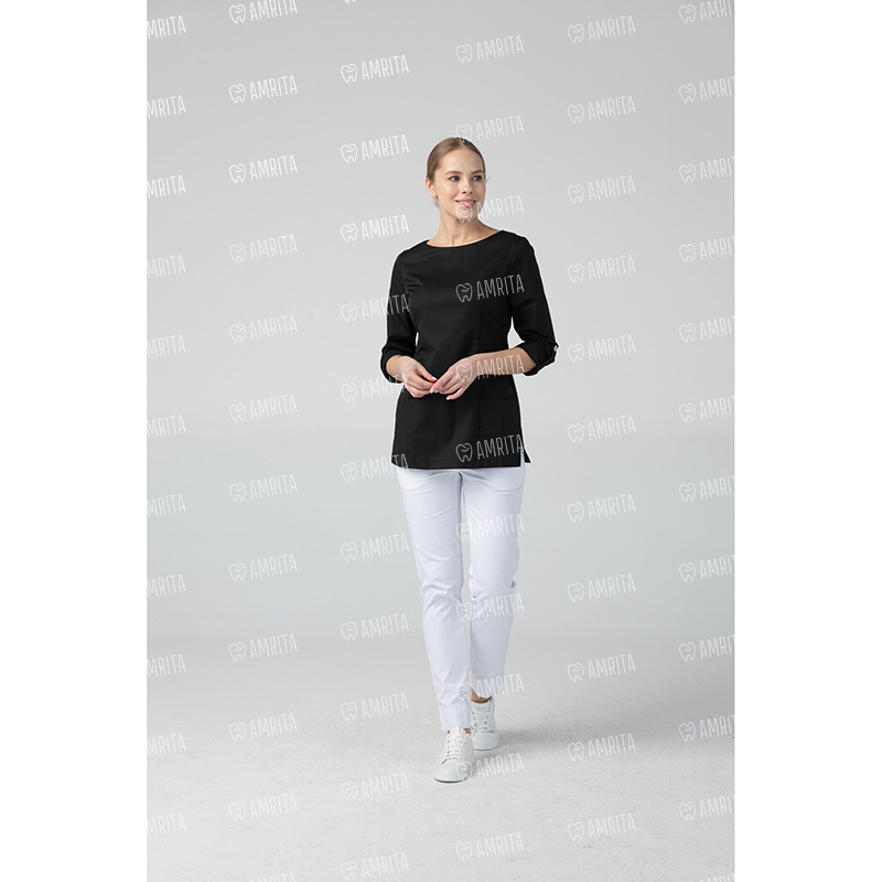 Медицинская туника женская с длинными рукавами от бренда Dr.Nice имеет округлый воротник, два накладных кармана спереди, разрезы по бокам и застёжку-молнию сзади. Длина рукава регулируется отворотом с закреплением пуговицей сбоку.