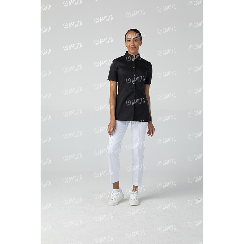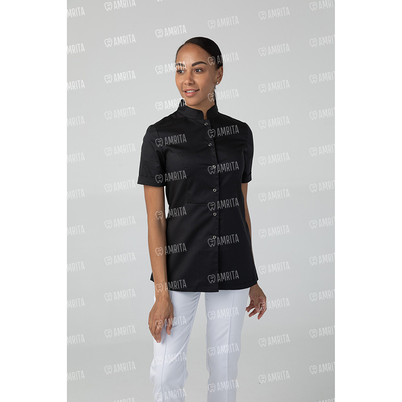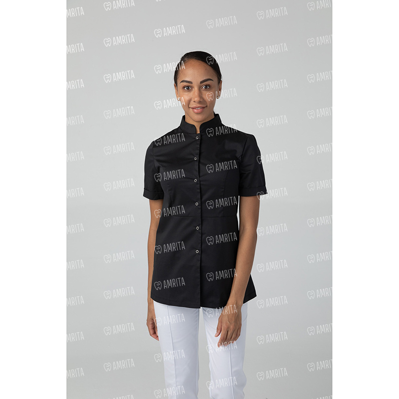 Медицинская туника отрезная по талии от бренда Dr.Nice имеет воротник-стойку, короткий рукав с отворотом и вытачки на груди для лучшего прилегания. Изделие застегивается на металлические кнопки спереди.