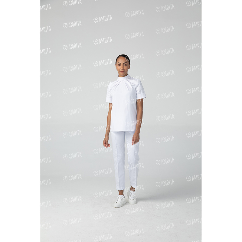 Медицинская женская туника бренда Dr.Nice выполнена с воротником-стойкой и с короткими рукавами. Модель застегивается сзади на кнопки.