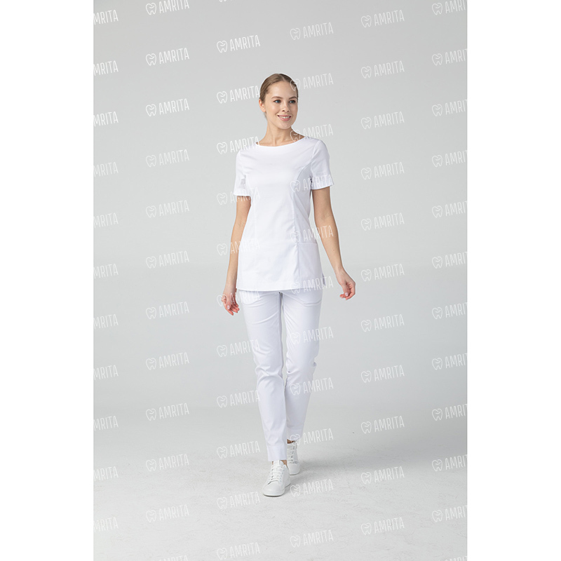 Медицинская женская туника бренда Dr.Nice с короткими рукавами имеет округлый воротник, застёжку-молнию сзади, два накладных кармана спереди и боковые разрезы для свободы движения.