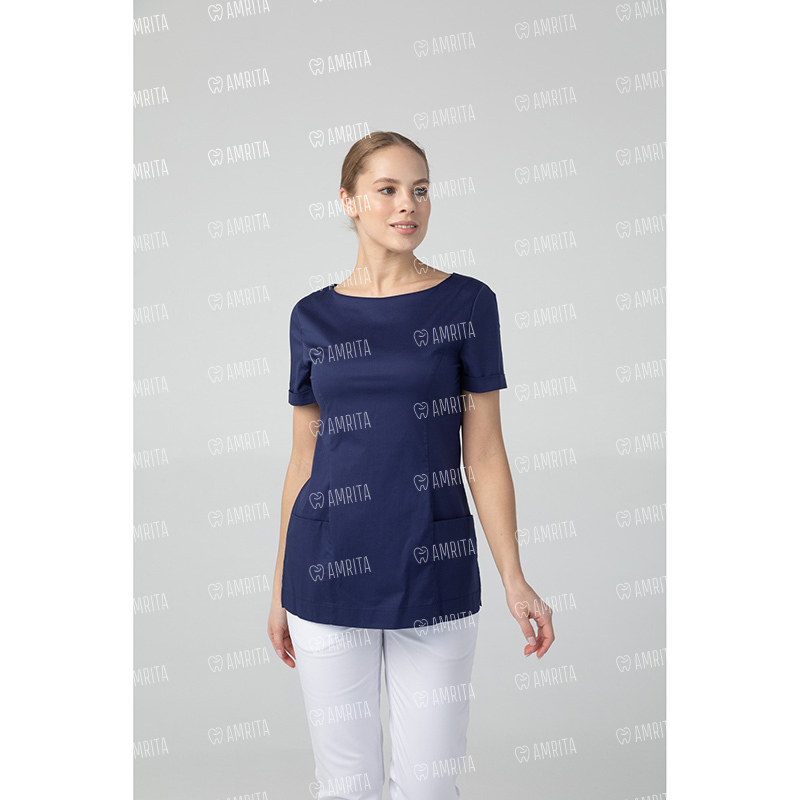 Медицинская женская туника бренда Dr.Nice с короткими рукавами имеет округлый воротник, застёжку-молнию сзади, два накладных кармана спереди и боковые разрезы для свободы движения.