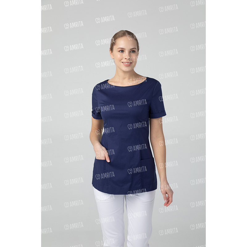 Медицинская женская туника бренда Dr.Nice с короткими рукавами имеет округлый воротник, застёжку-молнию сзади, два накладных кармана спереди и боковые разрезы для свободы движения.