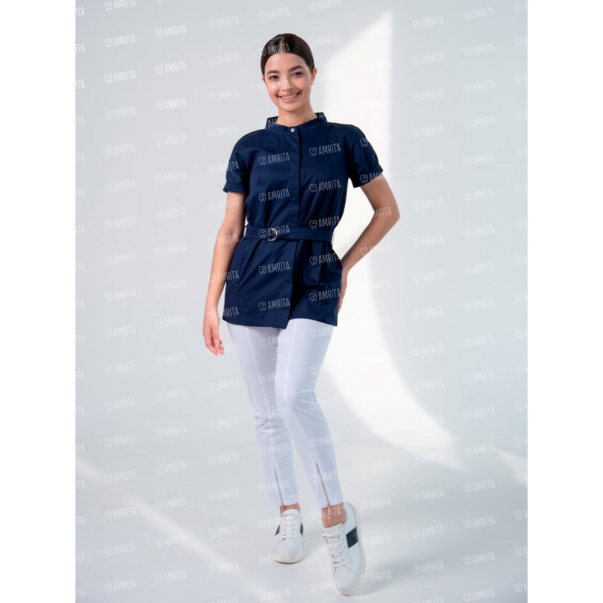 Женская медицинская туника от Mariita с коротким рукавом с отворотом имеет стильный крой с воротником стойкой на металлической кнопке и скрытой застежкой. Модель дополнена боковыми карманами и поясом на полукольцах.