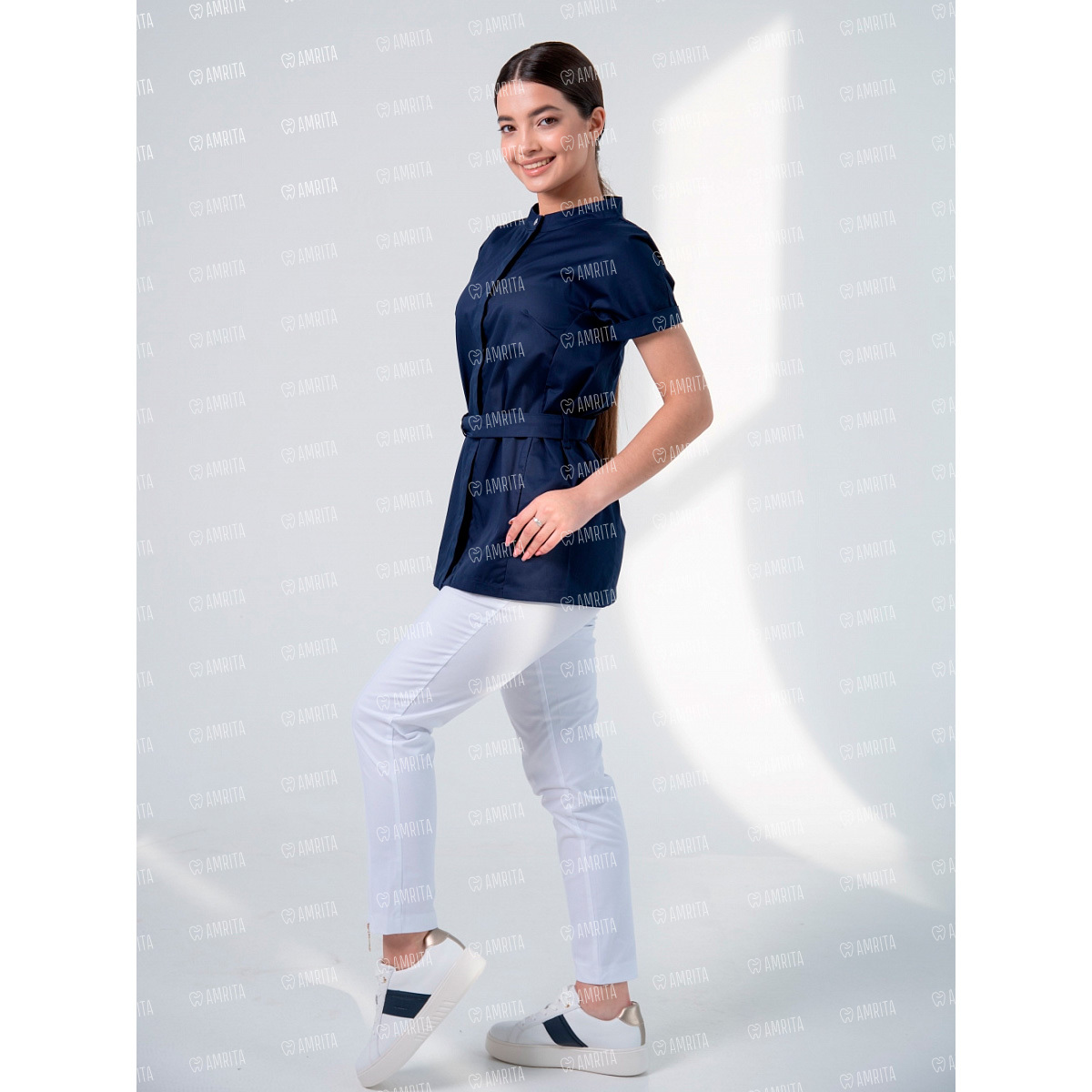 Женская медицинская туника от Mariita с коротким рукавом с отворотом имеет стильный крой с воротником стойкой на металлической кнопке и скрытой застежкой. Модель дополнена боковыми карманами и поясом на полукольцах.
