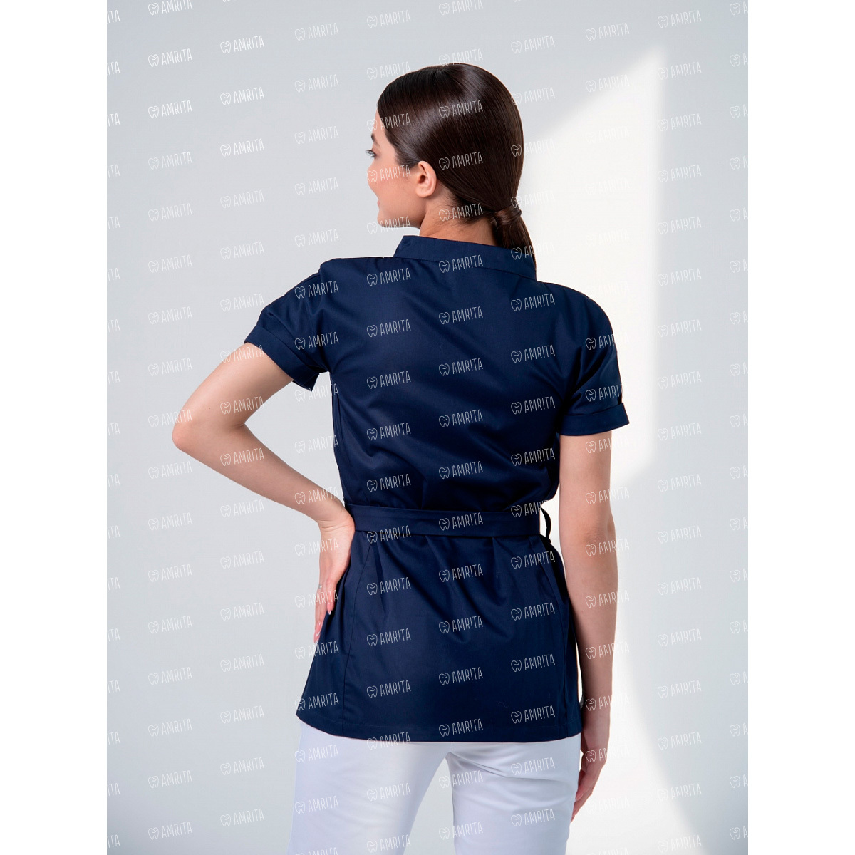 Женская медицинская туника от Mariita с коротким рукавом с отворотом имеет стильный крой с воротником стойкой на металлической кнопке и скрытой застежкой. Модель дополнена боковыми карманами и поясом на полукольцах.