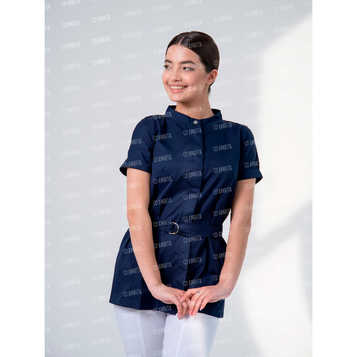 Женская медицинская туника от Mariita с коротким рукавом с отворотом имеет стильный крой с воротником стойкой на металлической кнопке и скрытой застежкой. Модель дополнена боковыми карманами и поясом на полукольцах.