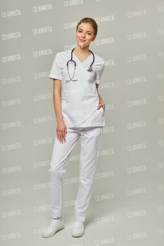 Женская медицинская туника с V-образным вырезом от бренда Dr.Nice выполнена в современном стиле с оригинальной дизайнерской отделкой с имитацией запаха по передней части изделия. Модель прямого кроя с коротким рукавом.