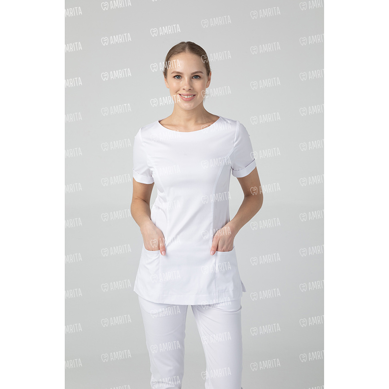 Медицинская женская туника бренда Dr.Nice с короткими рукавами имеет округлый воротник, застёжку-молнию сзади, два накладных кармана спереди и боковые разрезы для свободы движения.