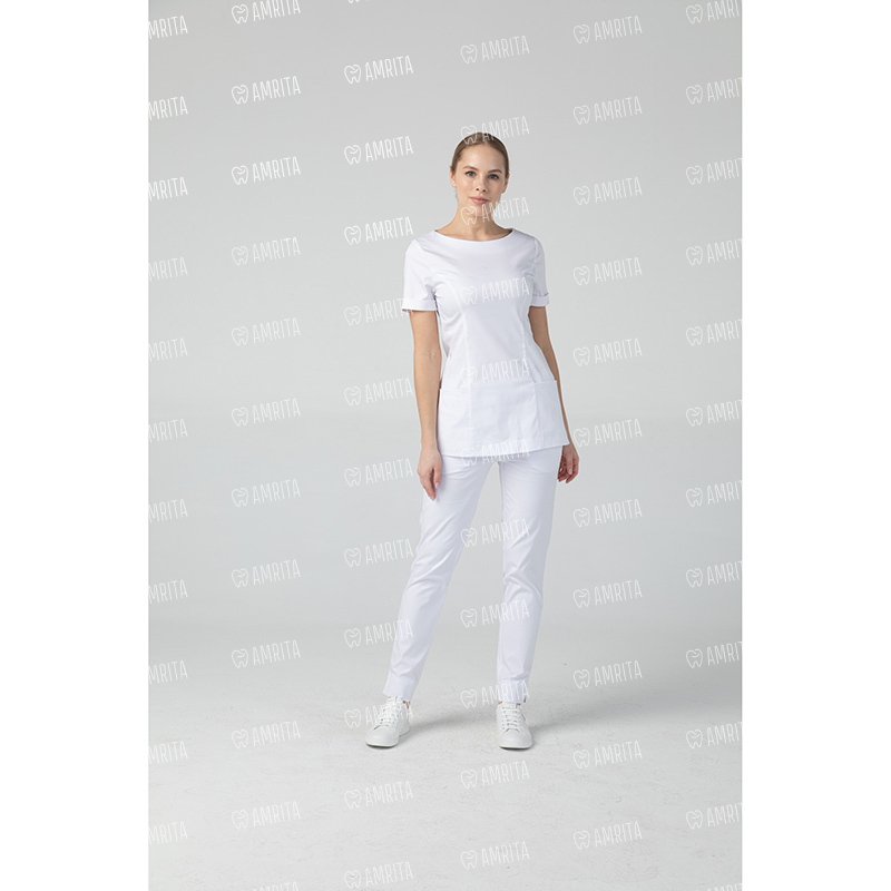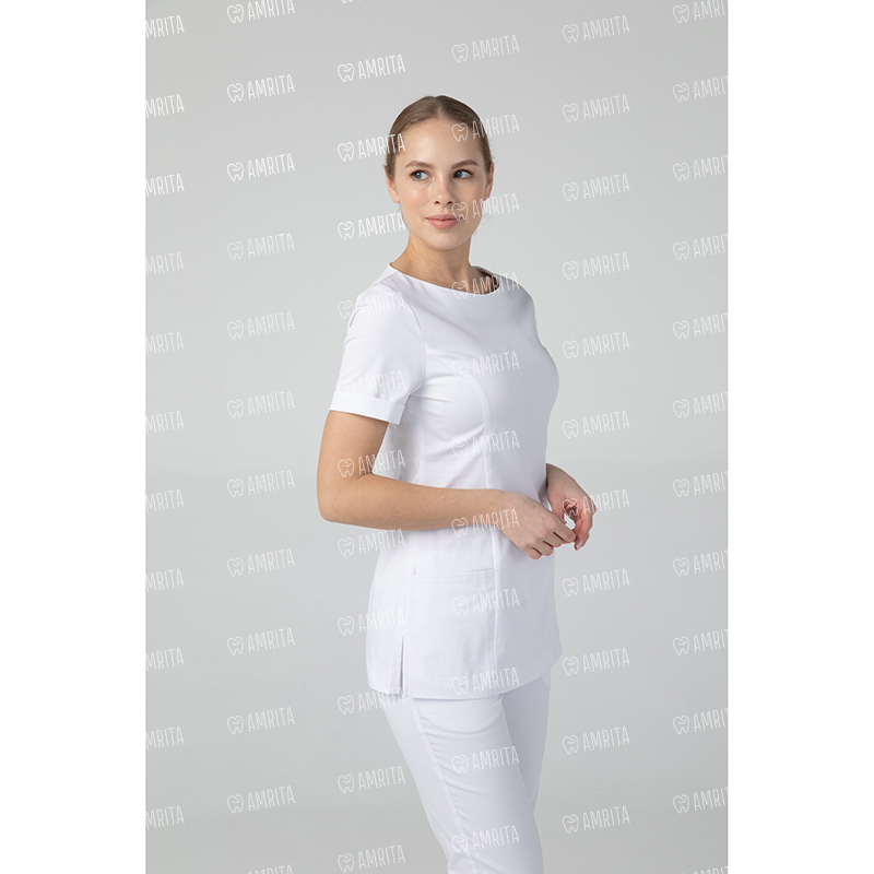 Медицинская женская туника бренда Dr.Nice с короткими рукавами имеет округлый воротник, застёжку-молнию сзади, два накладных кармана спереди и боковые разрезы для свободы движения.