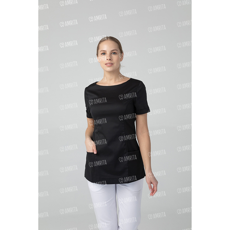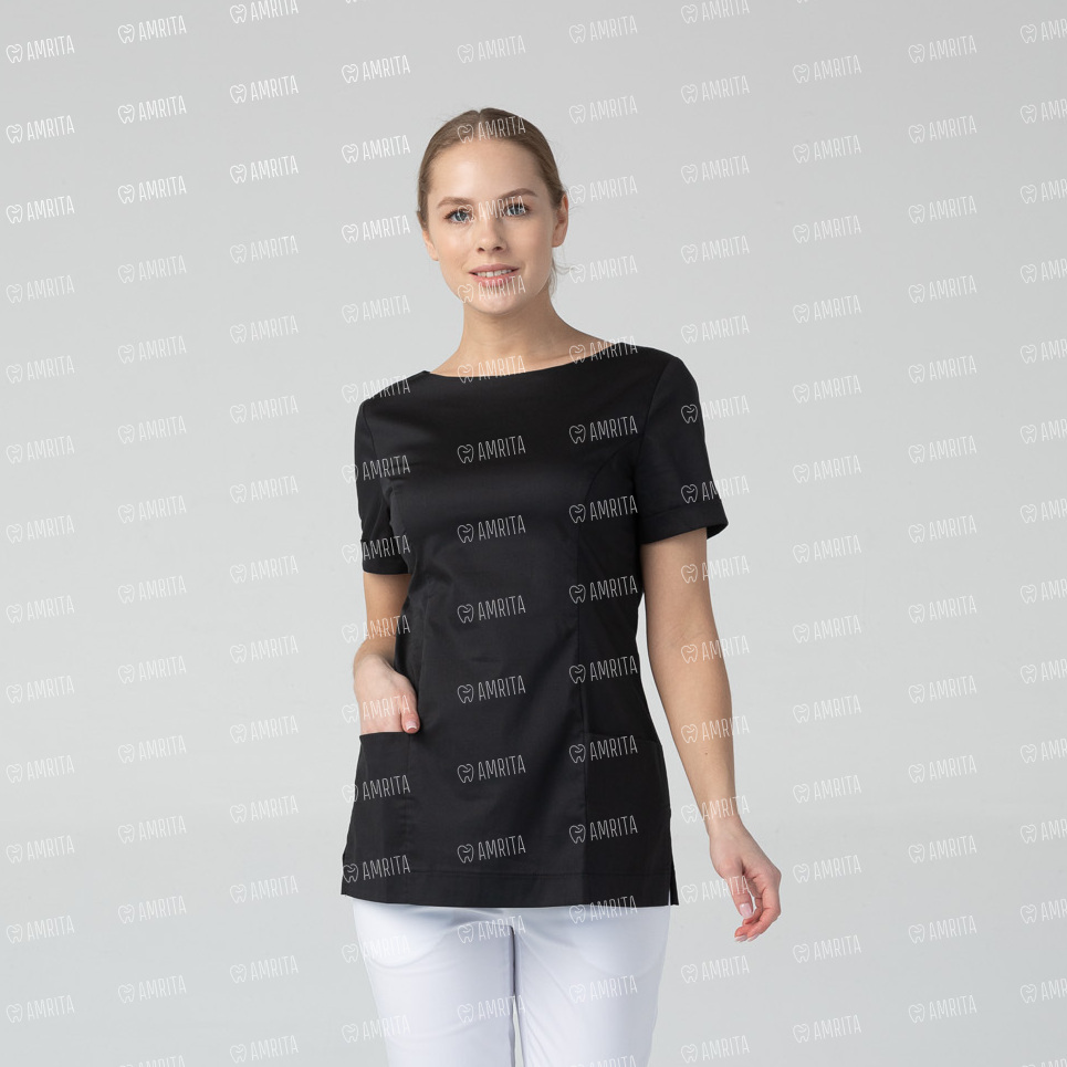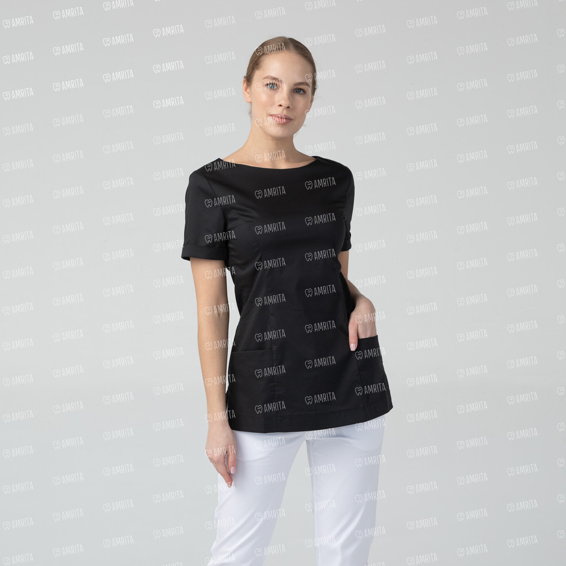 Медицинская женская туника бренда Dr.Nice с короткими рукавами имеет округлый воротник, застёжку-молнию сзади, два накладных кармана спереди и боковые разрезы для свободы движения.