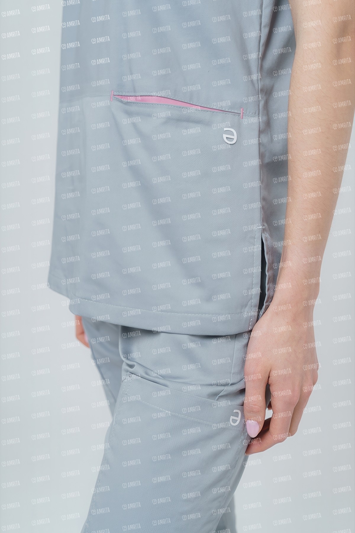 В основе дизайна — прямой крой, который дополнен асимметричным V-образным вырезом, переходящим в удобную застежку на кнопках на плече. Функциональность модели обеспечивают три прорезных кармана, элегантно подчеркнутые контрастной отделкой. Разрезы по бокам служат продуманной деталью для дополнительного удобства при движении.