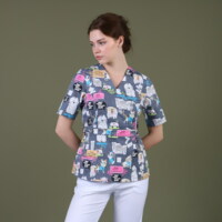- Дизайн: V-образный вырез, принт "Котики и собачки"