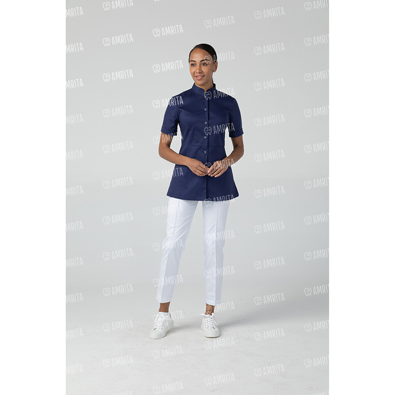 Медицинская туника отрезная по талии от бренда Dr.Nice имеет воротник-стойку, короткий рукав с отворотом и вытачки на груди для лучшего прилегания. Изделие застегивается на металлические кнопки спереди.