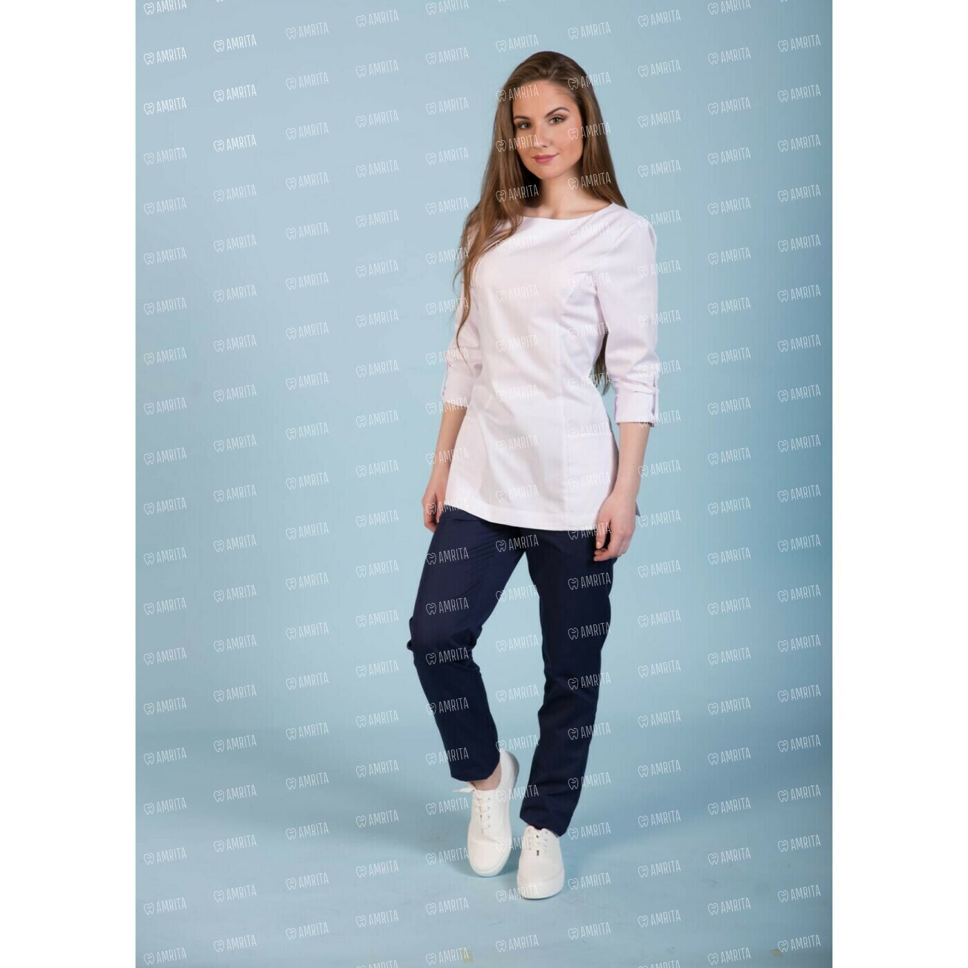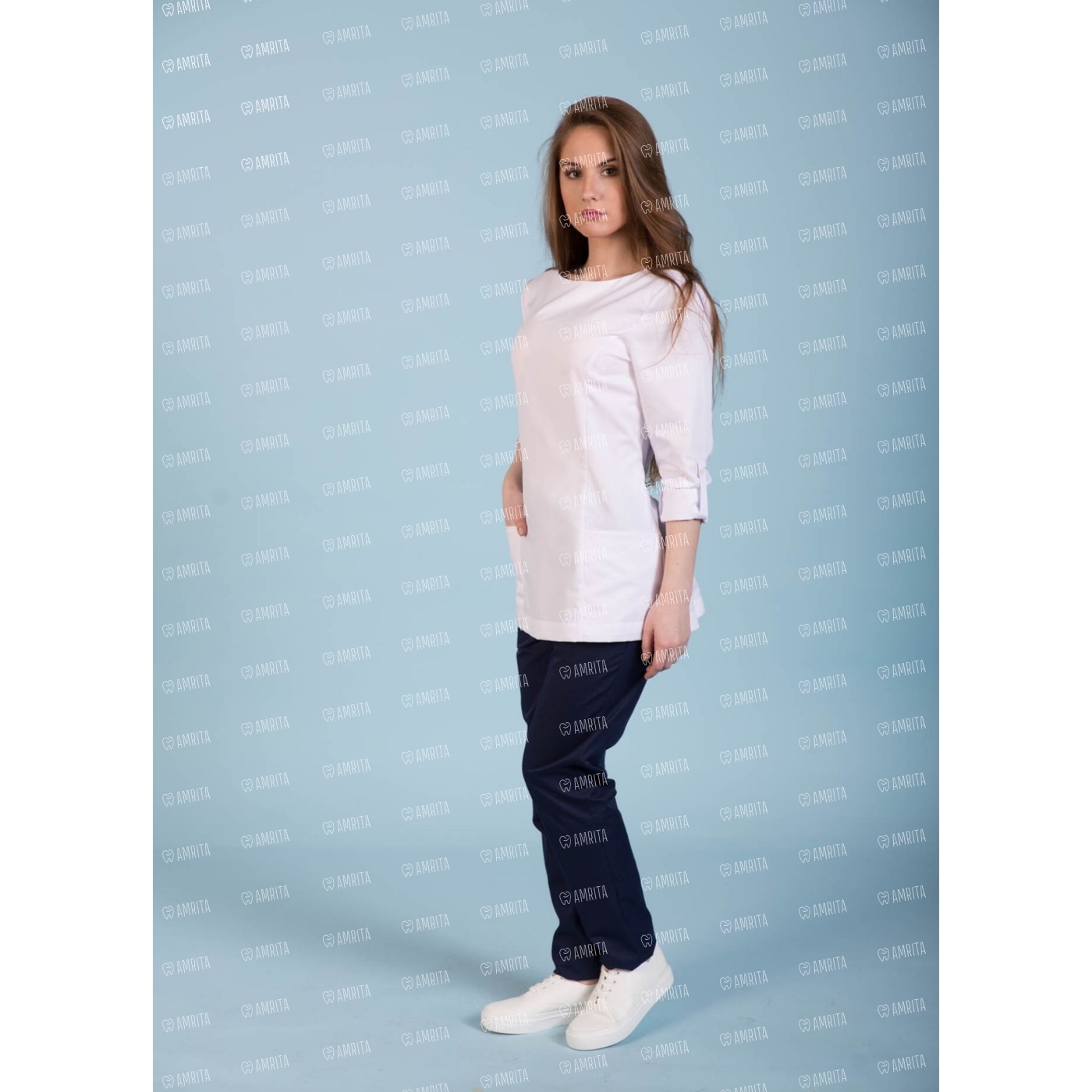 Женская туника Dr.Nice выполнена в современном крое с застежкой-молнией на спине. Длина рукава регулируется отворотом с закреплением пуговицей сбоку. По бокам туники имеются разрезы, дополнена модель двумя накладными карманами спереди.
