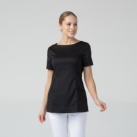 Медицинская женская туника бренда Dr.Nice с короткими рукавами имеет округлый воротник, застёжку-молнию сзади, два накладных кармана спереди и боковые разрезы для свободы движения.