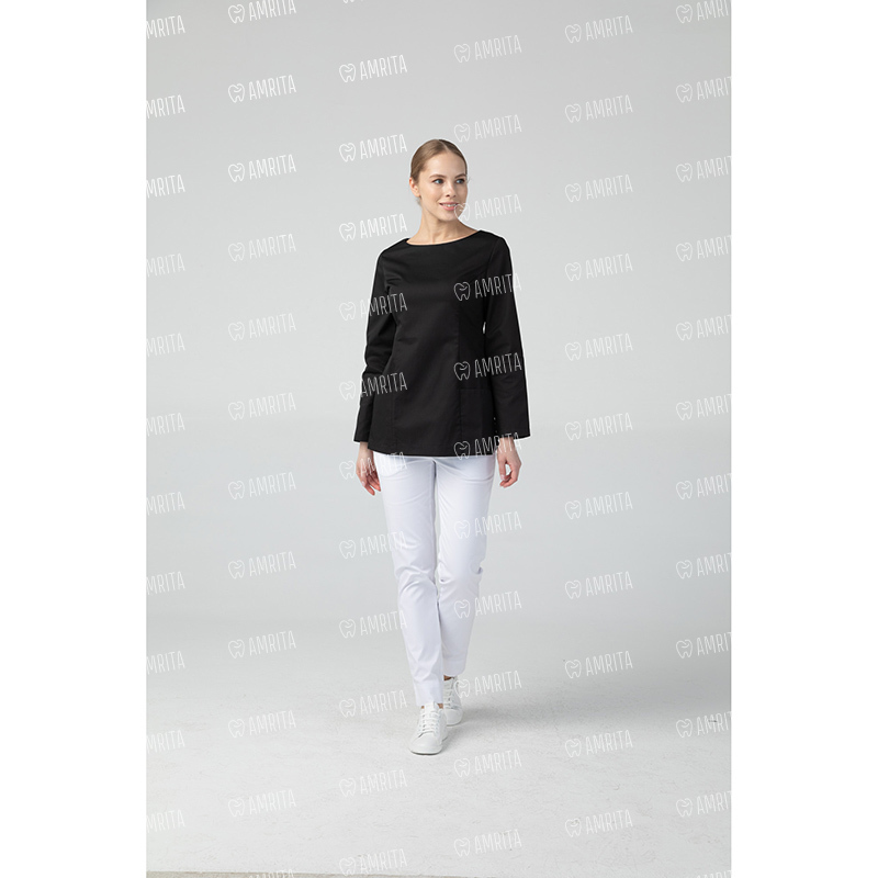 Женская туника Dr.Nice выполнена в современном крое с застежкой-молнией на спине. Длина рукава регулируется отворотом с закреплением пуговицей сбоку. По бокам туники имеются разрезы, дополнена модель двумя накладными карманами спереди.