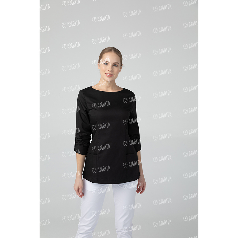 Женская туника Dr.Nice выполнена в современном крое с застежкой-молнией на спине. Длина рукава регулируется отворотом с закреплением пуговицей сбоку. По бокам туники имеются разрезы, дополнена модель двумя накладными карманами спереди.