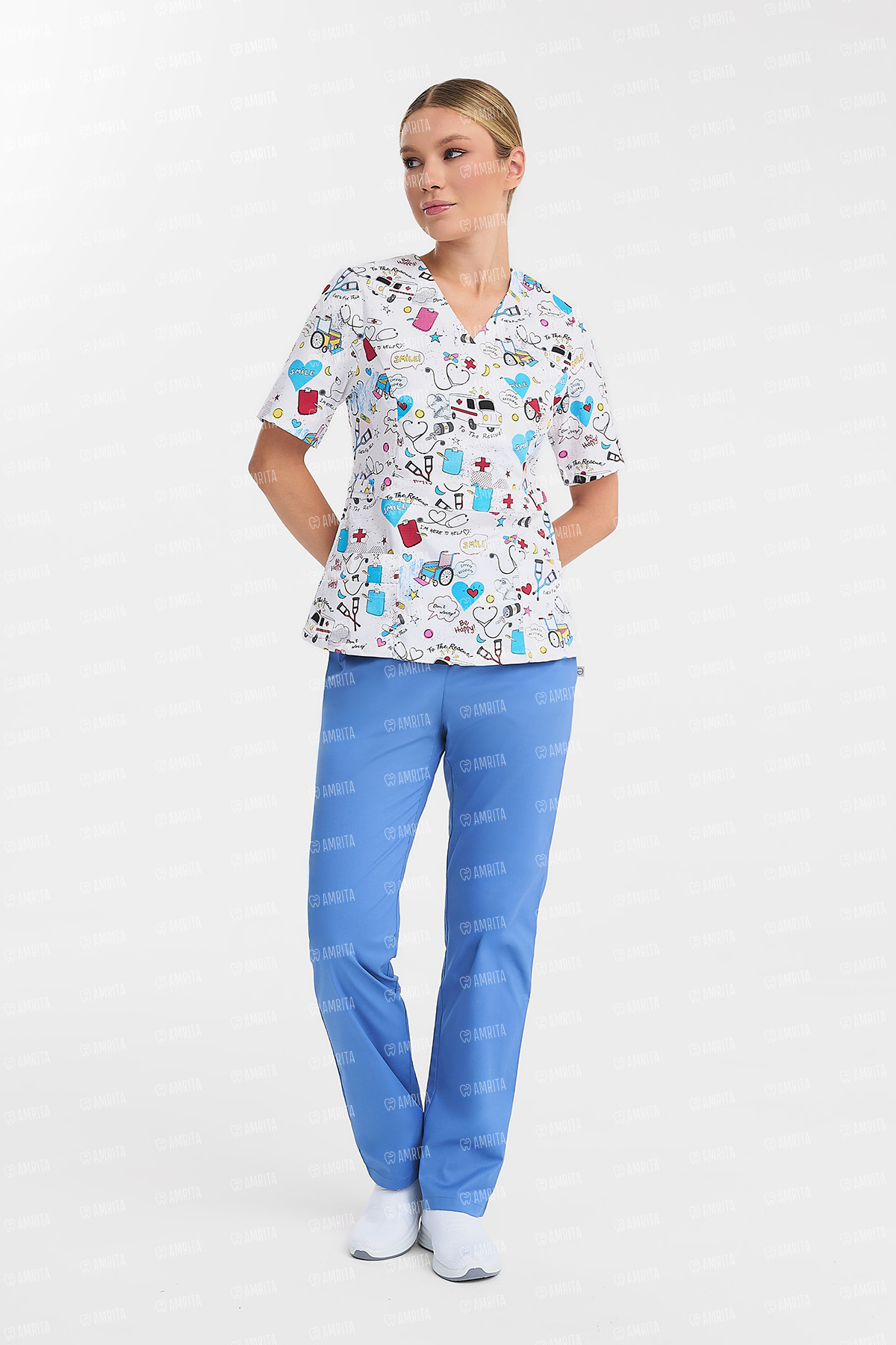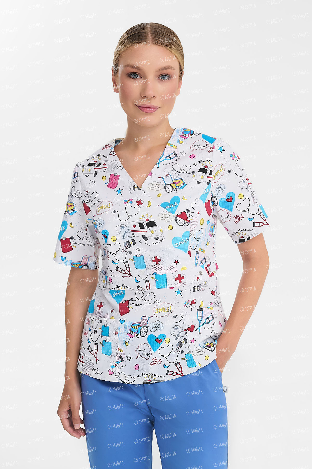 - Дизайн: V-образный вырез, принт "Скорая помощь"