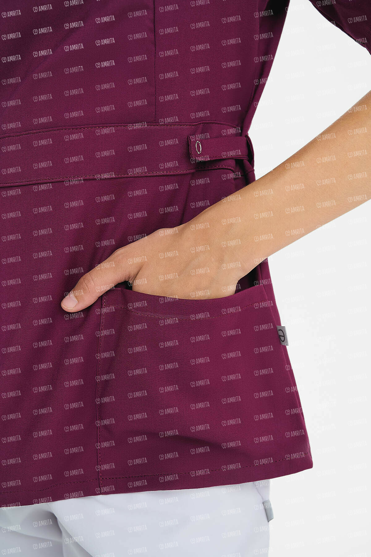 В основе дизайна — элегантный приталенный силуэт с имитацией запáха, формирующей V-образный вырез. Объем талии деликатно регулируется с помощью хлястиков на кнопках. Функциональность модели поддерживают два вместительных накладных кармана.