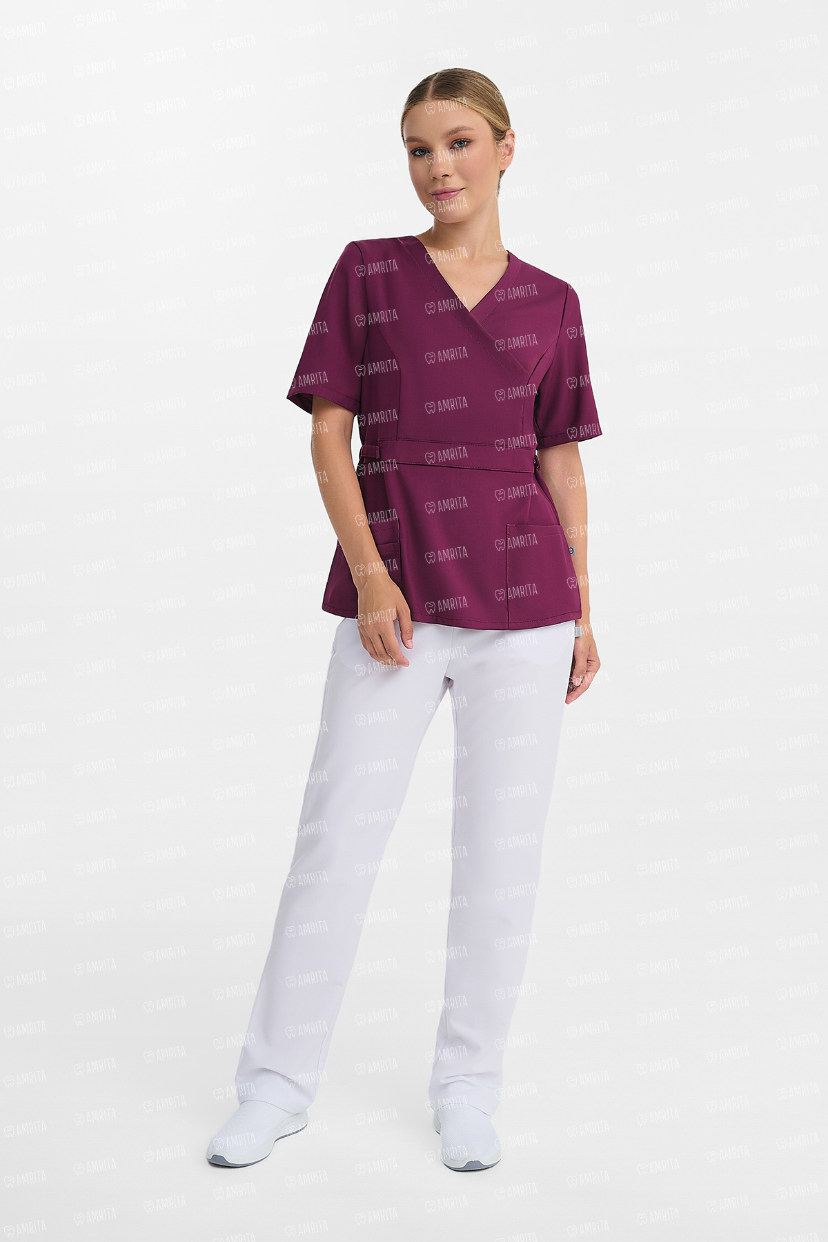В основе дизайна — элегантный приталенный силуэт с имитацией запáха, формирующей V-образный вырез. Объем талии деликатно регулируется с помощью хлястиков на кнопках. Функциональность модели поддерживают два вместительных накладных кармана.
