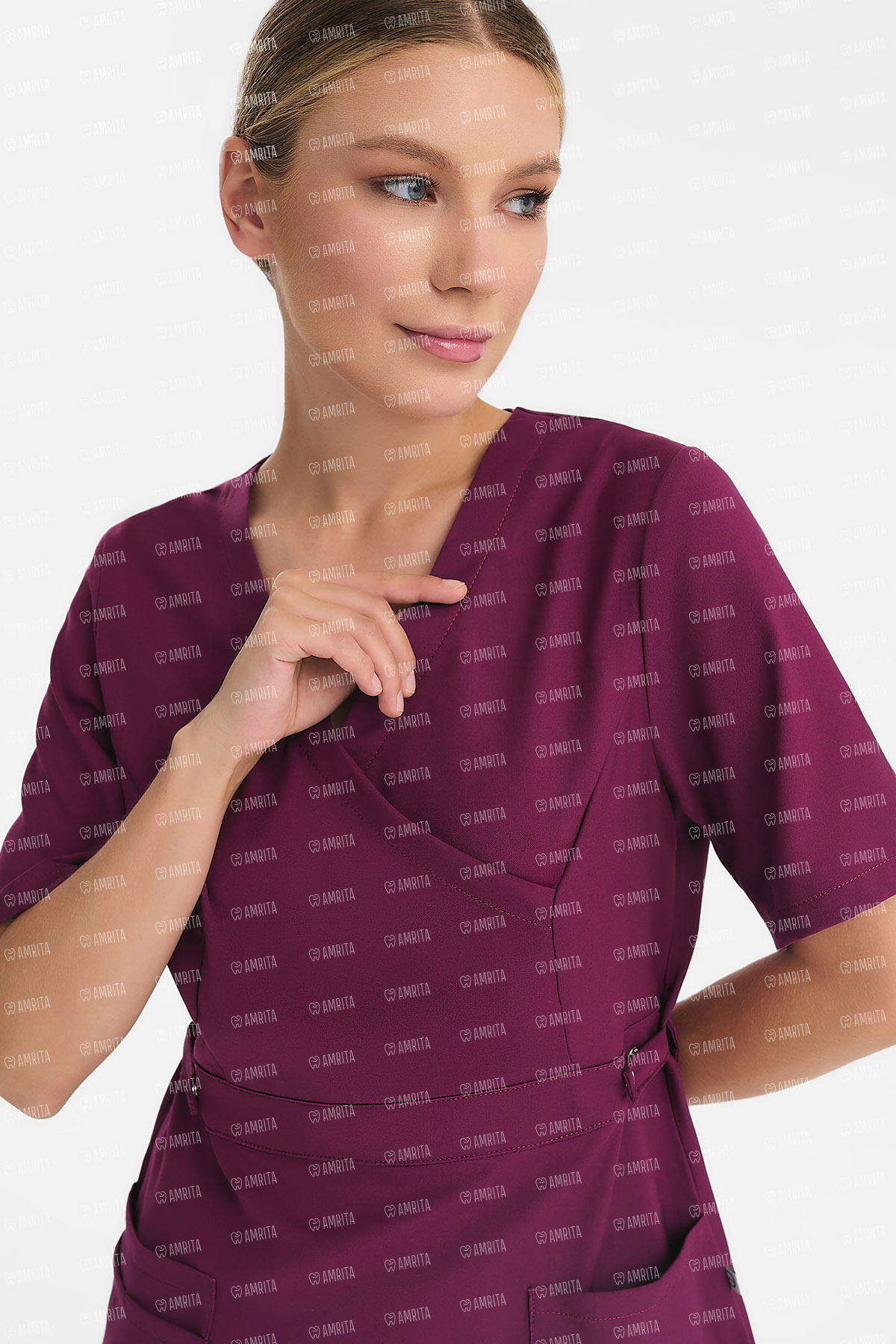 В основе дизайна — элегантный приталенный силуэт с имитацией запáха, формирующей V-образный вырез. Объем талии деликатно регулируется с помощью хлястиков на кнопках. Функциональность модели поддерживают два вместительных накладных кармана.