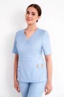 В основе дизайна — элегантный приталенный силуэт с имитацией запáха, формирующей V-образный вырез. Объем талии деликатно регулируется с помощью хлястиков на кнопках. Главным акцентом модели выступает оригинальный термопринт «Лапки» на накладных карманах, который добавляет образу индивидуальности и шарма.