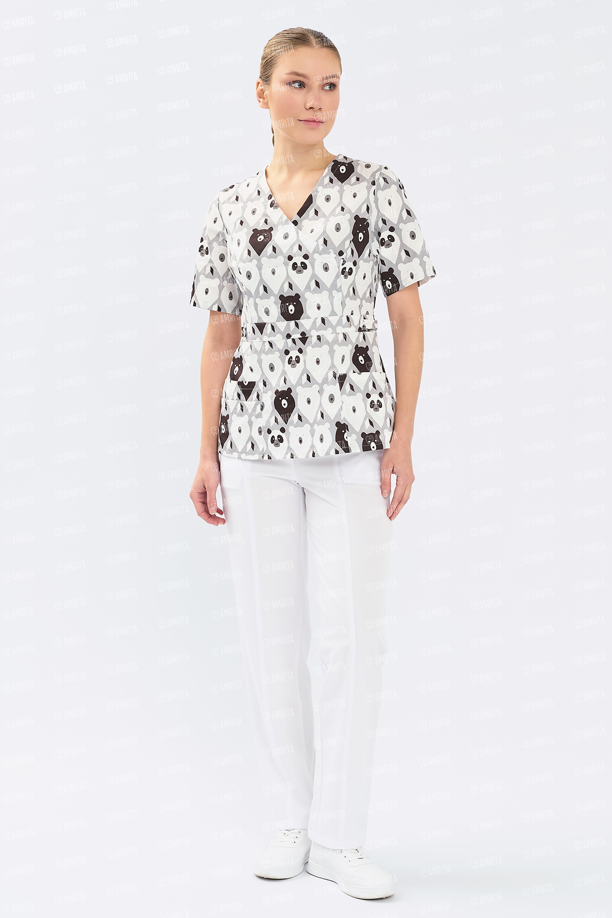 - Дизайн: V-образный вырез, принт "Медведи"