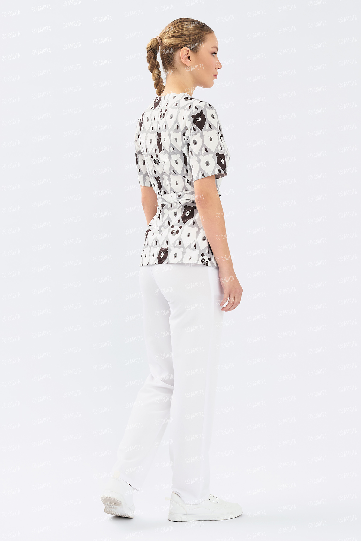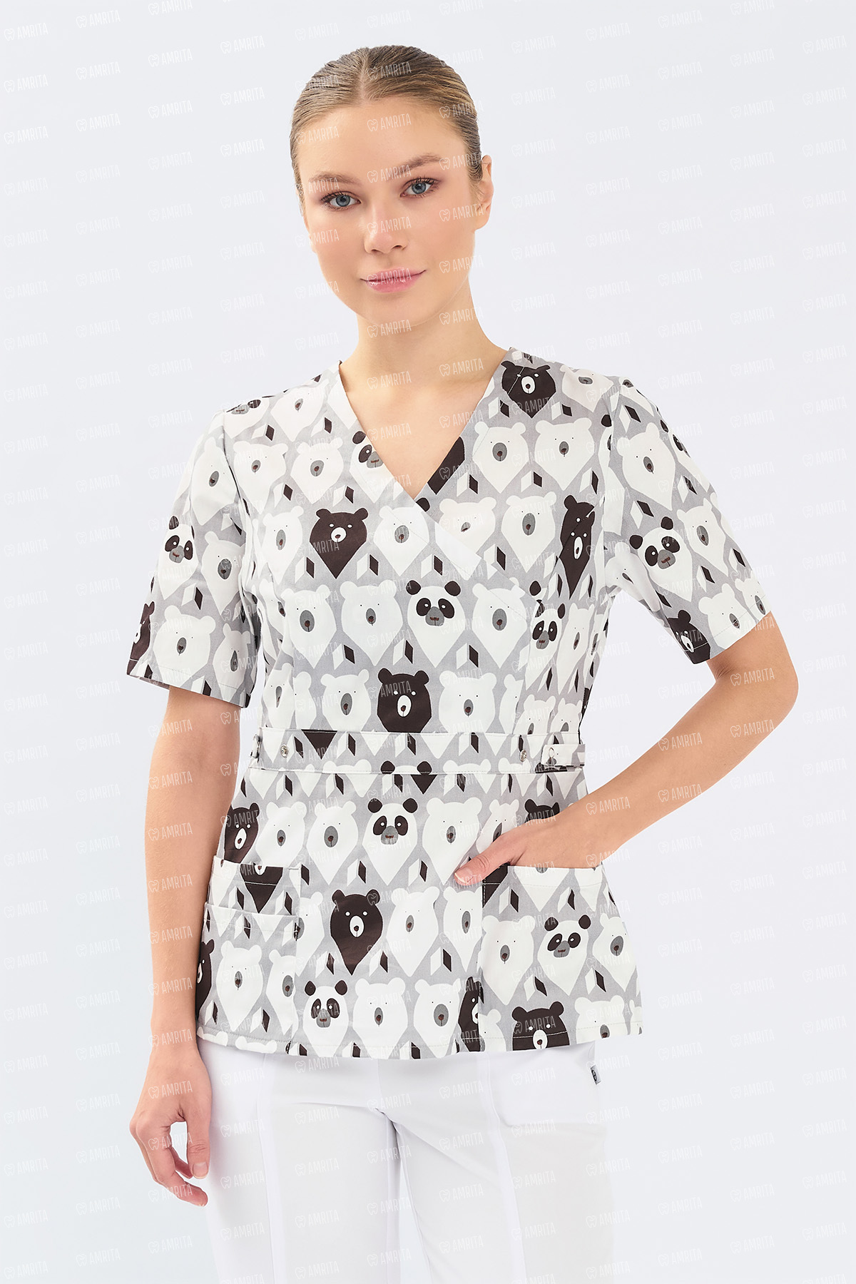 - Дизайн: V-образный вырез, принт "Медведи"