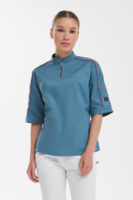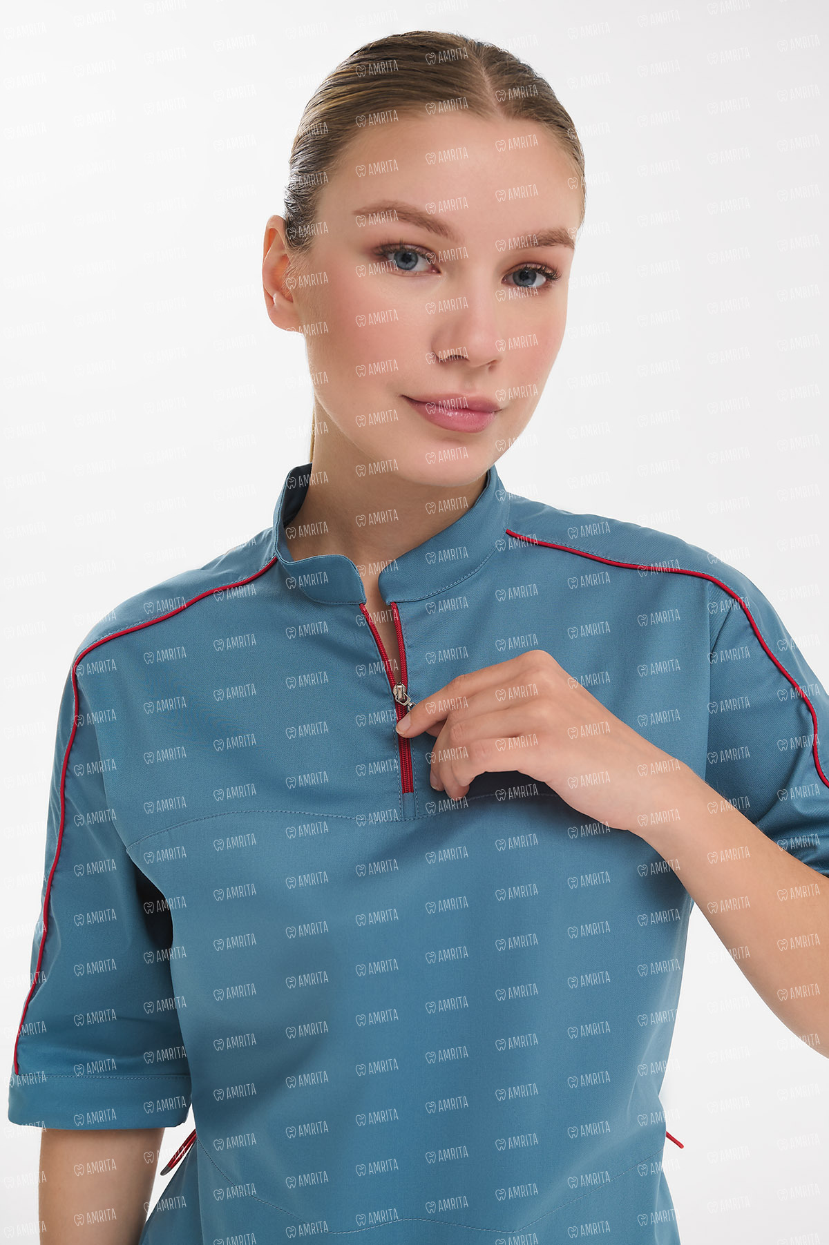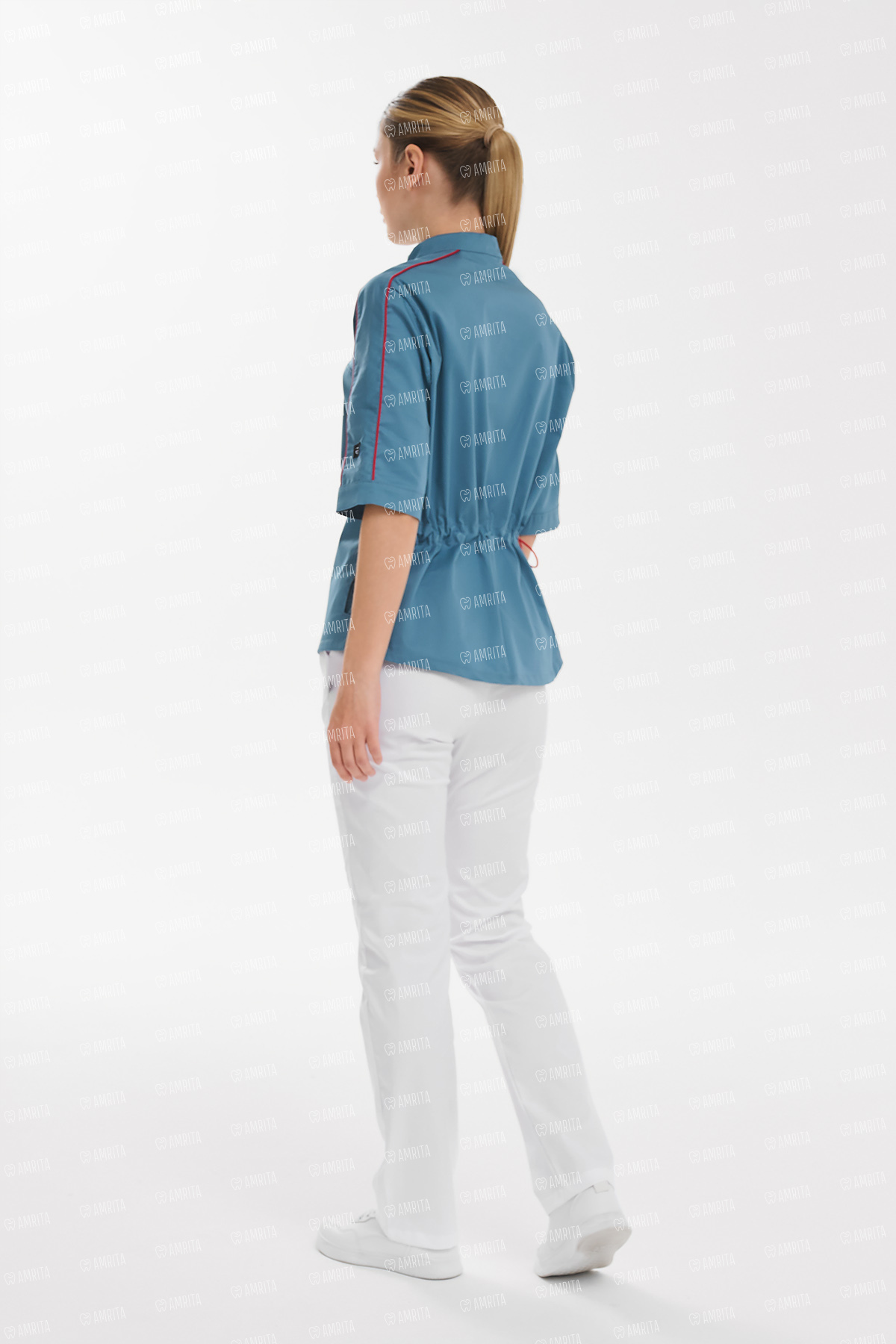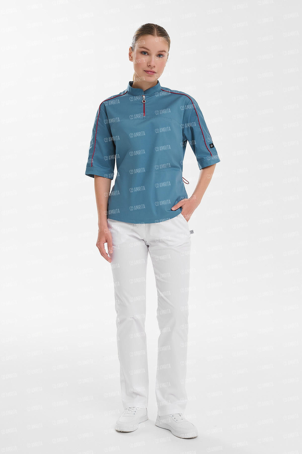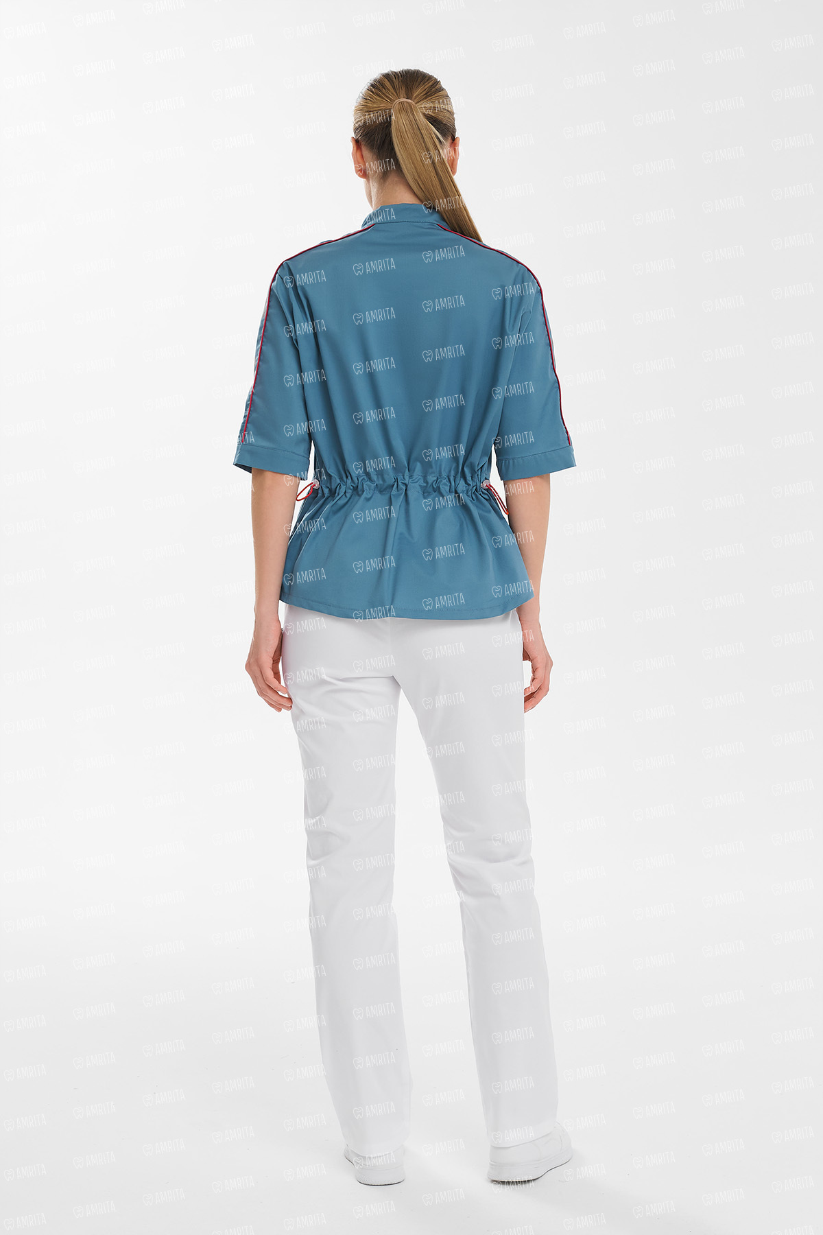В основе дизайна — приталенный силуэт, регулирующийся кулиской на талии сзади. Ключевым элементом выступает контрастный кант, который подчеркивает архитектурные линии кроя на плечах и рукавах. Воротник-стойка и центральная застежка на молнии с кольцом-пуллером поддерживают современный и динамичный характер модели.