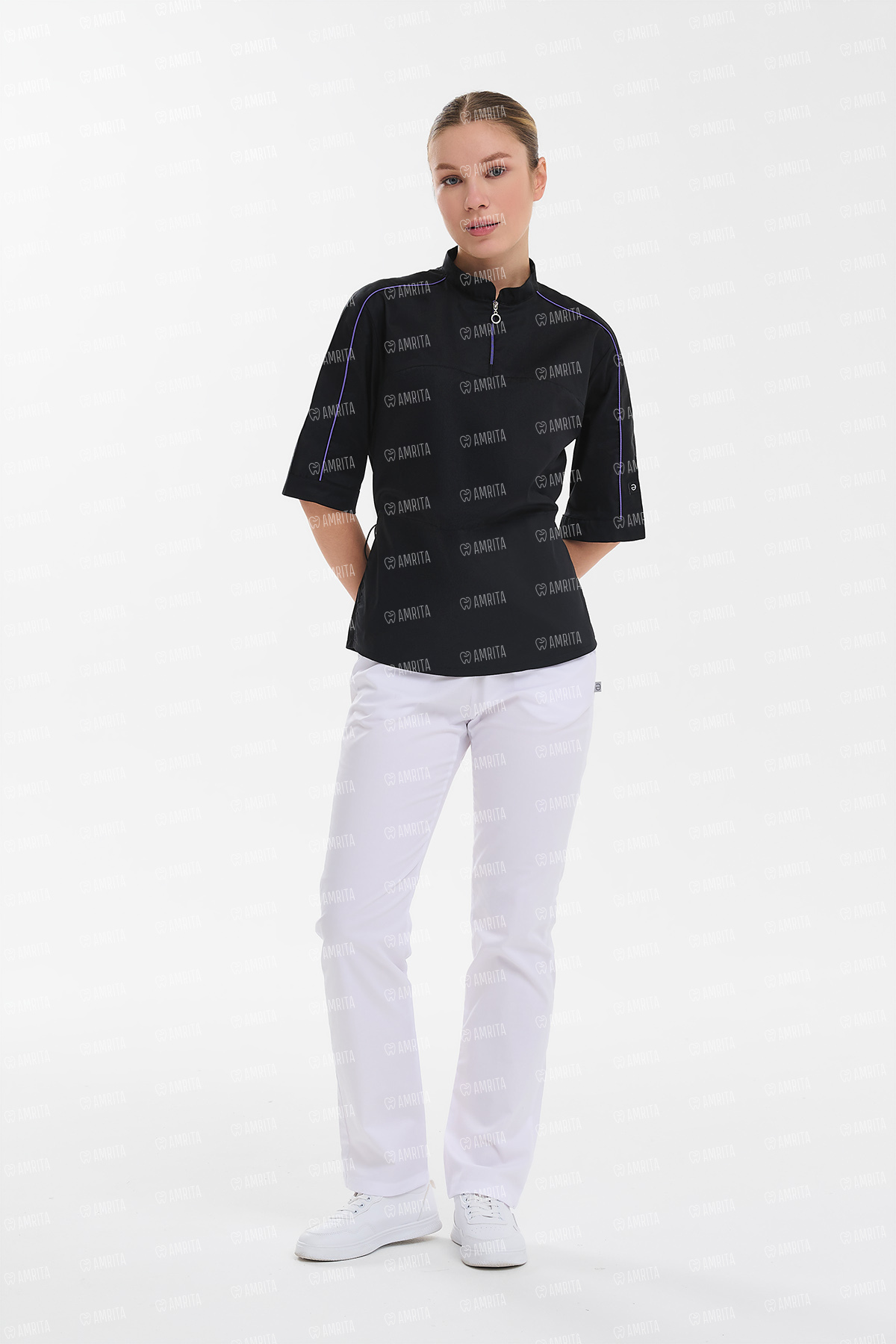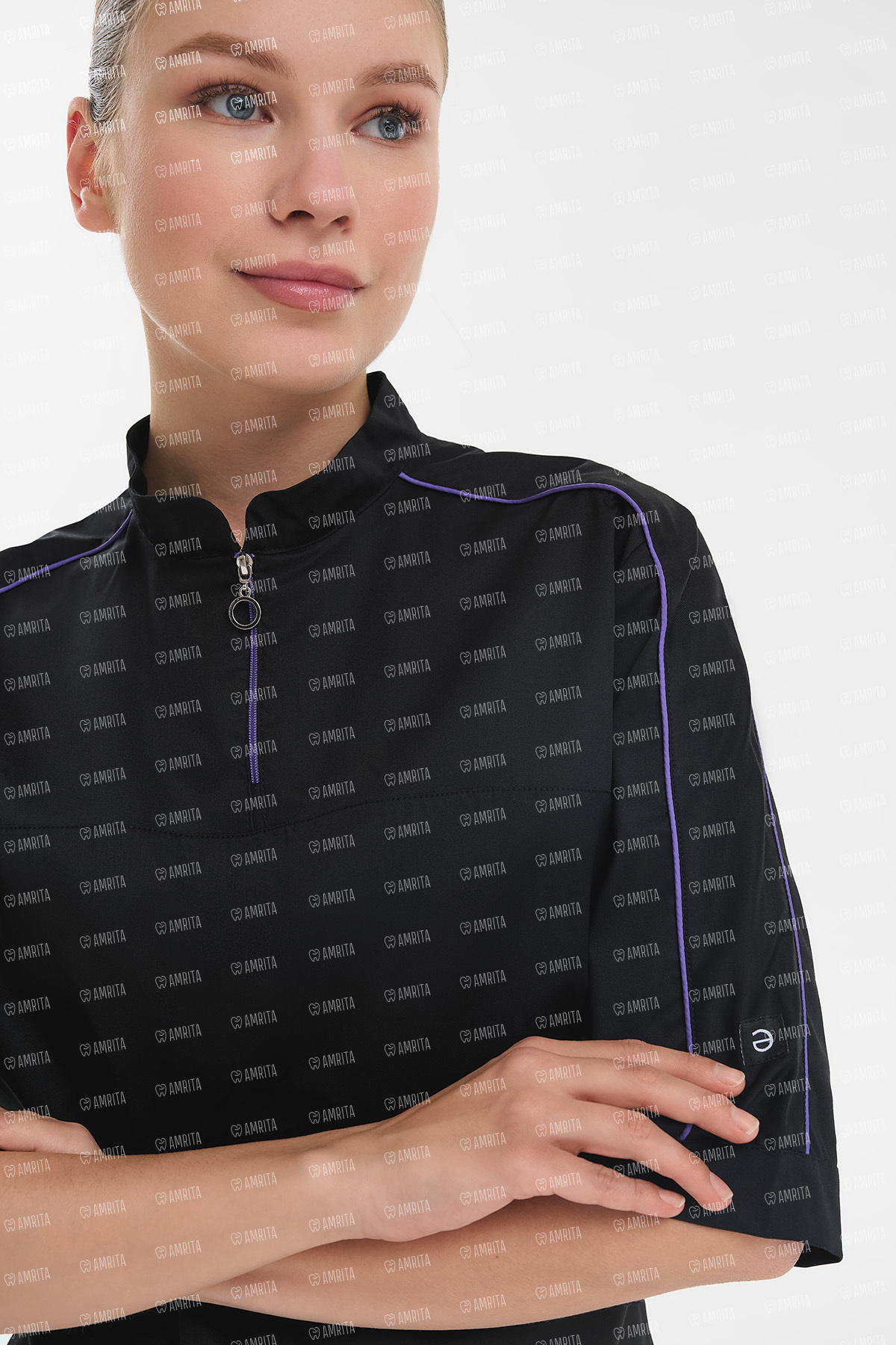 В основе дизайна — приталенный силуэт, регулирующийся кулиской на талии сзади. Ключевым элементом выступает контрастный кант, который подчеркивает архитектурные линии кроя на плечах и рукавах. Воротник-стойка и центральная застежка на молнии с кольцом-пуллером поддерживают современный и динамичный характер модели.