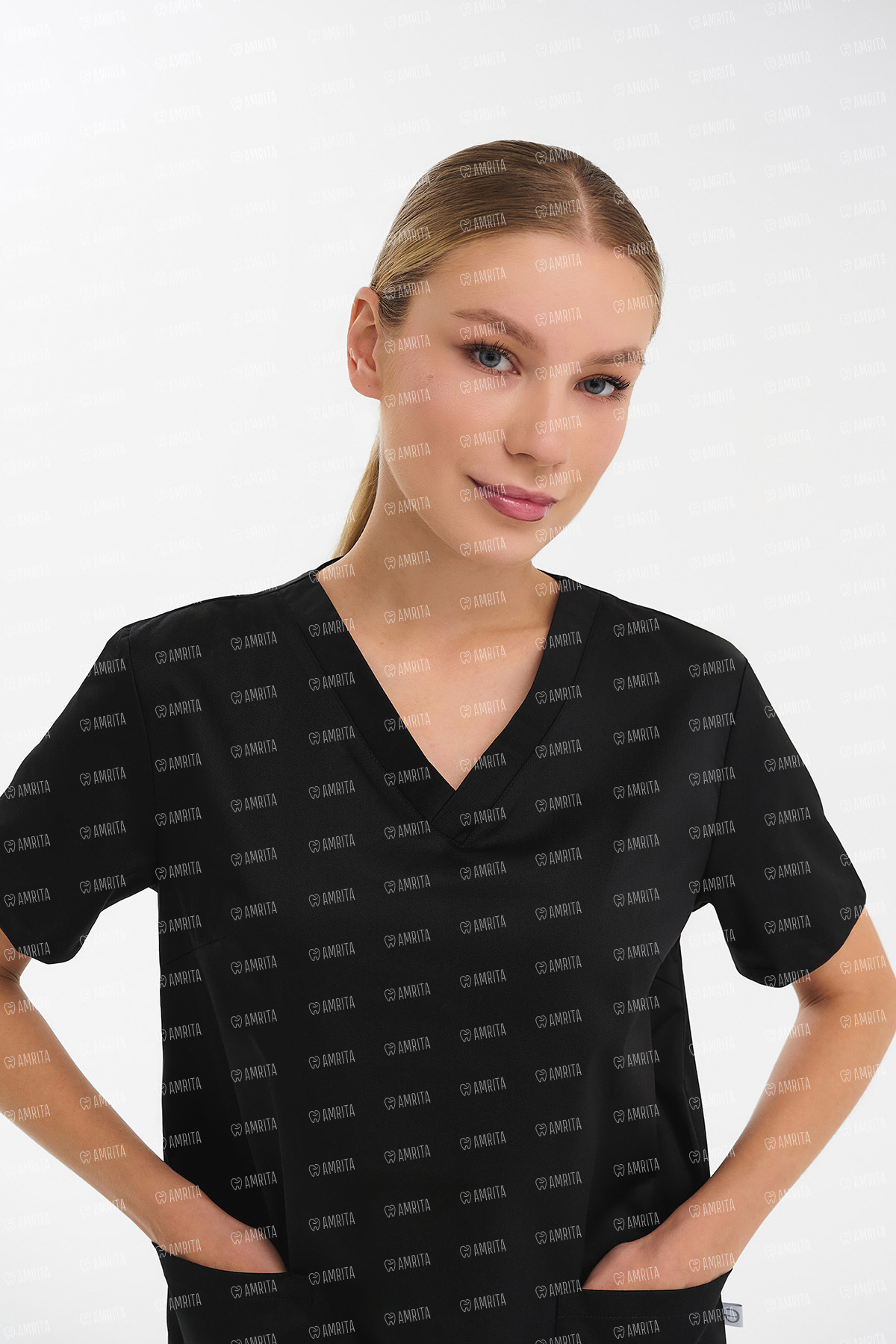 В основе дизайна — полуприлегающий крой, сформированный вертикальными рельефными швами для создания женственного и точного силуэта. Классический V-образный вырез формирует элегантную линию шеи, а три вместительных накладных кармана и разрезы по бокам обеспечивают функциональность и удобство в работе.