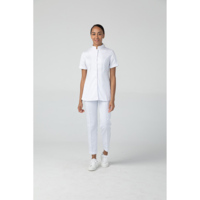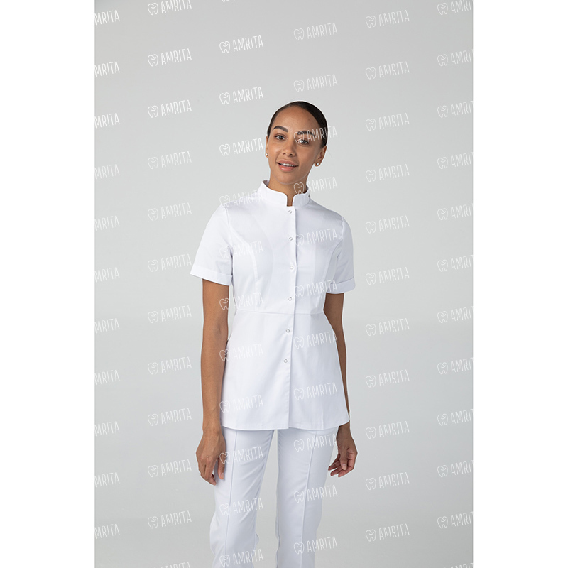 Медицинская туника отрезная по талии от бренда Dr.Nice имеет воротник-стойку, короткий рукав с отворотом и вытачки на груди для лучшего прилегания. Изделие застегивается на металлические кнопки спереди.