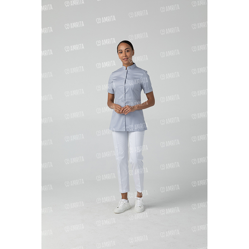Медицинская туника отрезная по талии от бренда Dr.Nice имеет воротник-стойку, короткий рукав с отворотом и вытачки на груди для лучшего прилегания. Изделие застегивается на металлические кнопки спереди.