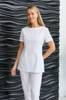 Медицинская женская туника бренда Dr.Nice с короткими рукавами имеет округлый воротник, застёжку-молнию сзади, два накладных кармана спереди и боковые разрезы для свободы движения.