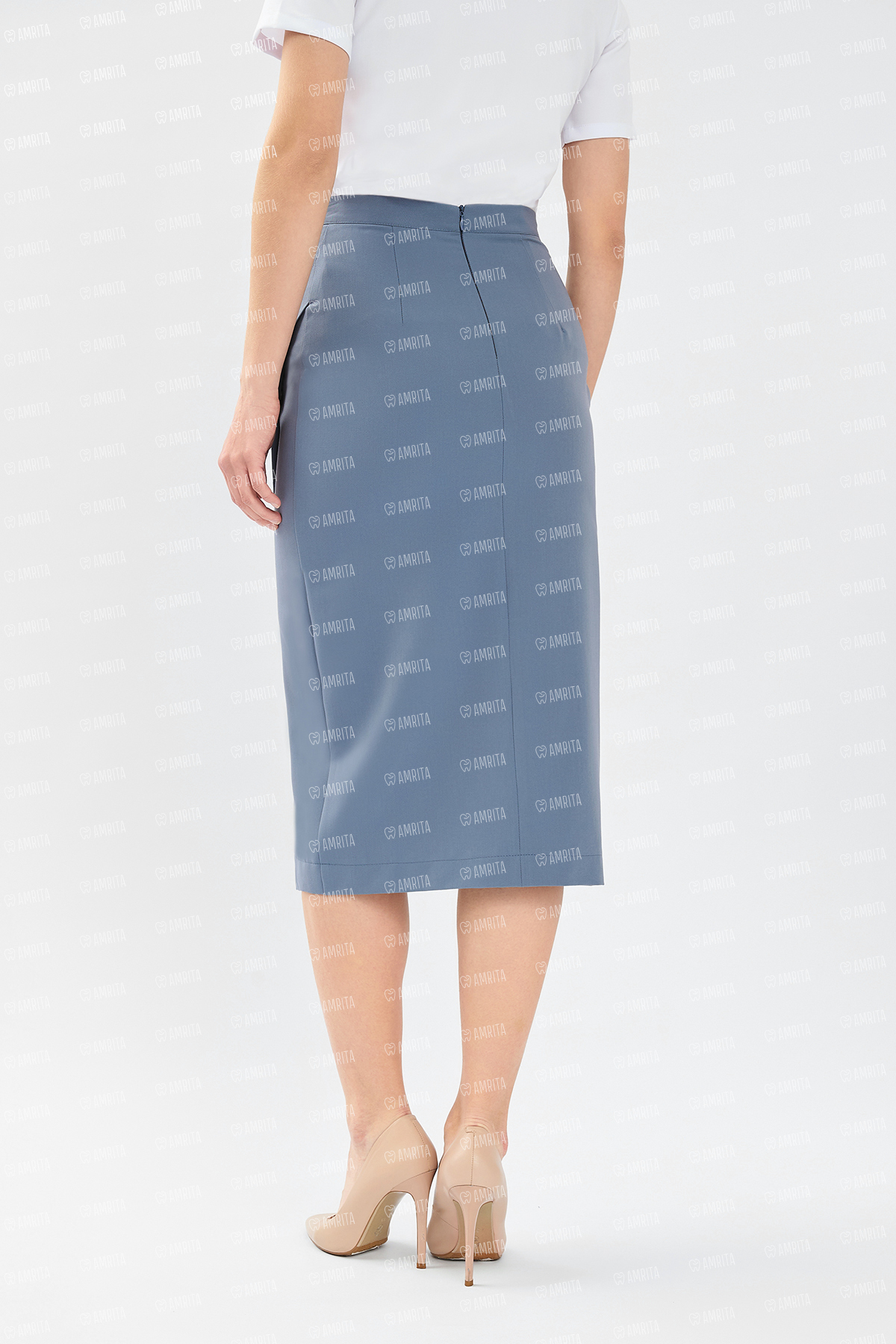 В основе дизайна — прилегающий крой, формирующий элегантный силуэт-карандаш. Ключевым элементом выступает асимметричный диагональный запáх, который добавляет образу динамики и современного звучания. Потайная молния сзади обеспечивает безупречную посадку и сохраняет чистоту линий.