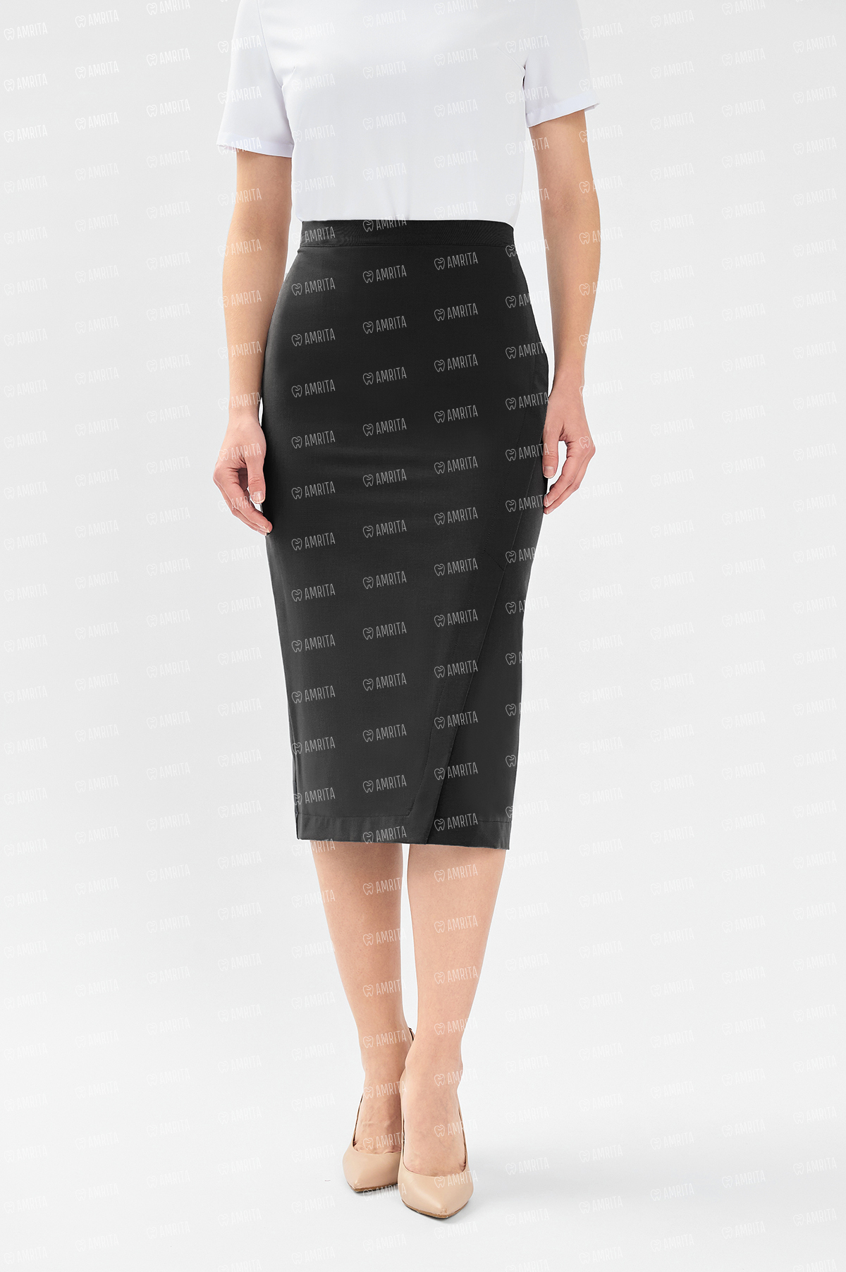 В основе дизайна — прилегающий крой, формирующий элегантный силуэт-карандаш. Ключевым элементом выступает асимметричный диагональный запáх, который добавляет образу динамики и современного звучания. Потайная молния сзади обеспечивает безупречную посадку и сохраняет чистоту линий.