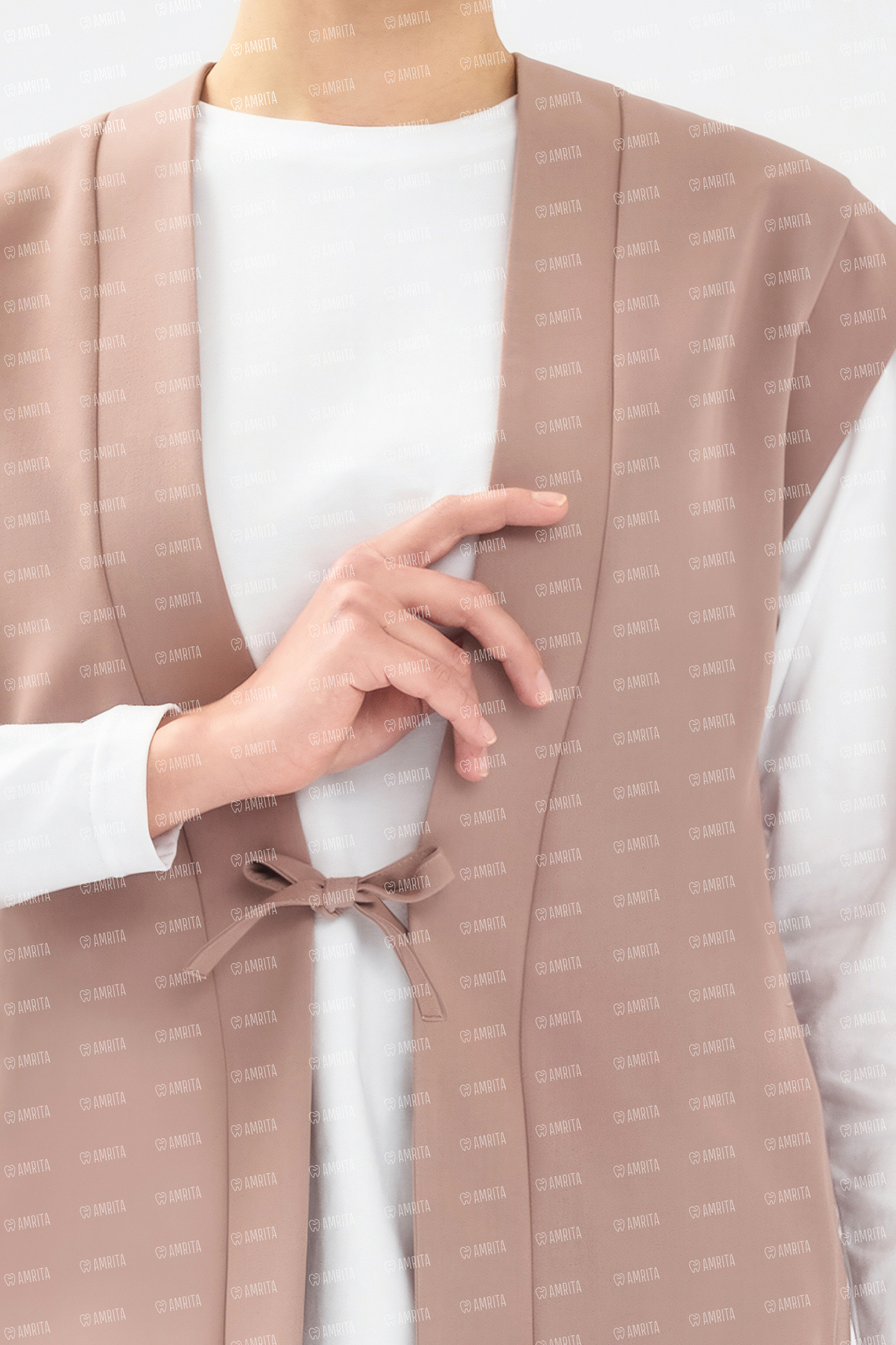 В основе дизайна — прямой, открытый крой, создающий элегантные вертикальные линии. Ключевым элементом выступает структурированное плечо, которое формирует четкую и выразительную линию силуэта. Деликатная застежка в виде тонких завязок позволяет мягко акцентировать талию, сохраняя при этом лаконичность и легкость образа.
