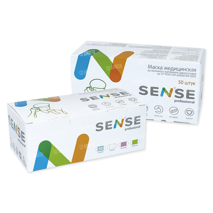 Маски медицинские одноразовые SENSE, на резинках трех и четырехслойные.