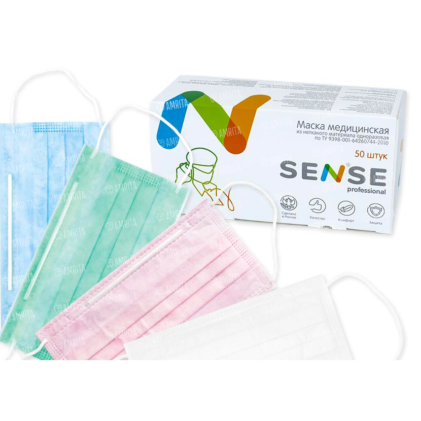 Маски медицинские одноразовые SENSE, на резинках и трехслойные.