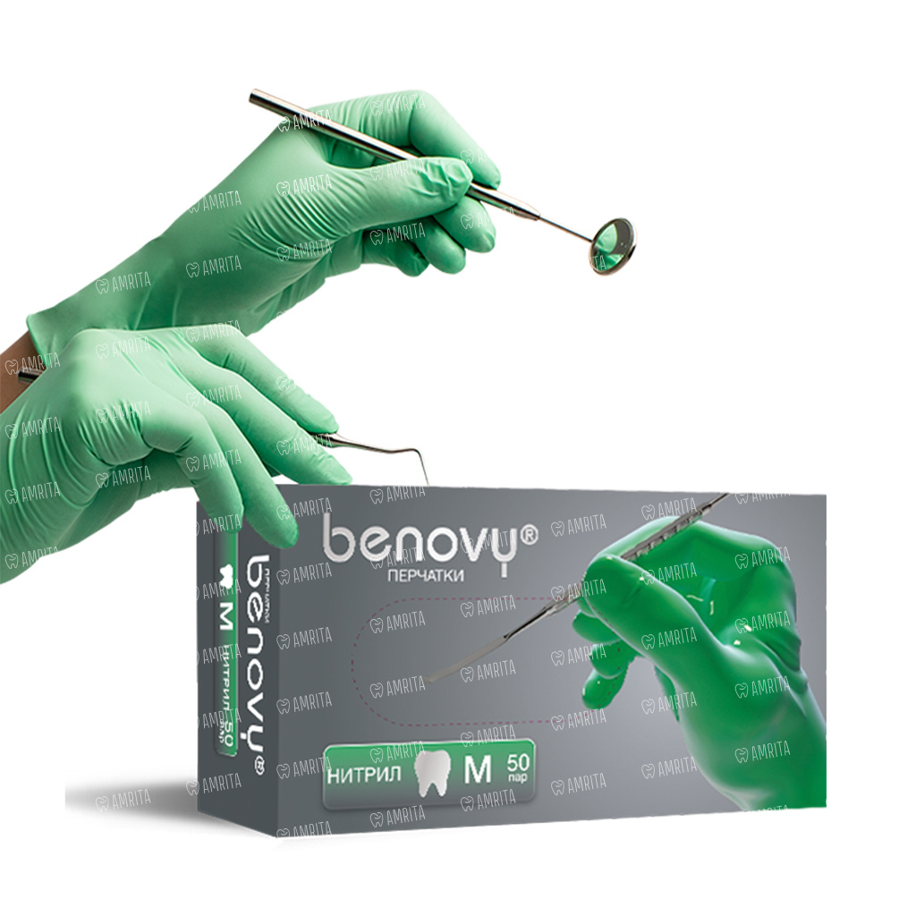 Перчатки одноразовые Benovy Dental Formula, нитриловые, нестерильные, текстурированные, хлорированные, зеленые, M, 50 пар